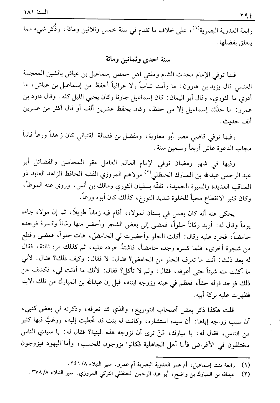 فيها توفي الإمام محدث الشام ومفتي أهل حمص إسماعيل بن عياش بالشين المعجمة العنسي قال يزيد بن هارون: ما رأيت شامياً ولا عراقياً أحفظ من إسماعيل بن عياش، ما أدري ما الثوري، وقال أبو اليمان: كان إسماعيل جارنا وكان يحيي الليل كله. وقال داود بن عمرو: ما حدثنا إسماعيل إلا من حفظ، وكان يحفظ عشرين ألف أو قال أكثر من عشرين ألف حديث. وفيها توفي قاضي مصر أبو معاوية، ومفضل بن فضالة القتباني كان زاهداً ورعاً قانتاً مجاب الدعوة عاش أربعاً وسبعين سنة. وفيها في شهر رمضان توفي الإمام العالم العامل مقر المحاسن والفضائل أبوعبد الرحمن عبد الله بن المبارك الحنظلي مولاهم المروزي الفقيه الحافظ الزاهد العابد ذو المناقب العديدة والسيرة الحميدة، تفقه بسفيان الثوري ومالك بن أنس، وروى عنه الموطأ، وكان كثير الانقطاع محباً للخلوة شديد التورع، كذلك كان أبوه ورعاً. يحكى عنه أنه كان يعمل في بستان لمولاه، اقام فيه زماناً طويلاً، ثم إن مولاه جاءه يوماً وقال له: اريد رماناً حلواً، فمضى إلى بعض الشجر وأحضر منها رماناً وكسره فوجده حامضاً، فحرد عليه وقال: اكلت الحلو وأحضرت لي الحامض، هات حلواً، فمضى وقطع من شجرة آخرى، فلما كسره وجده حامضاً، فاشتد حرده عليه، ثم كذلك مرة ثالثة، فقال له بعد ذلك: انت ما تعرف الحلو من الحامض؟ فقال: لا فقال: وكيف ذلك؟ فقال: لأني ما أكلت منه شيئاً حتى أعرفه، فقال: ولم لا تأكل؟ فقال: لأنك ما أذنت لي، فكشف عن ذلك فوجد قوله حقاً، فعظم في عينه وزوجه ابنته، قيل إن عبد الله بن المبارك من تلك الابنة فظهرت عليه بركة أبيه. قلت هكذا ذكر بعض أصحاب التواريخ، والذي كنا نعرفه، وذكرته في بعض كتبي