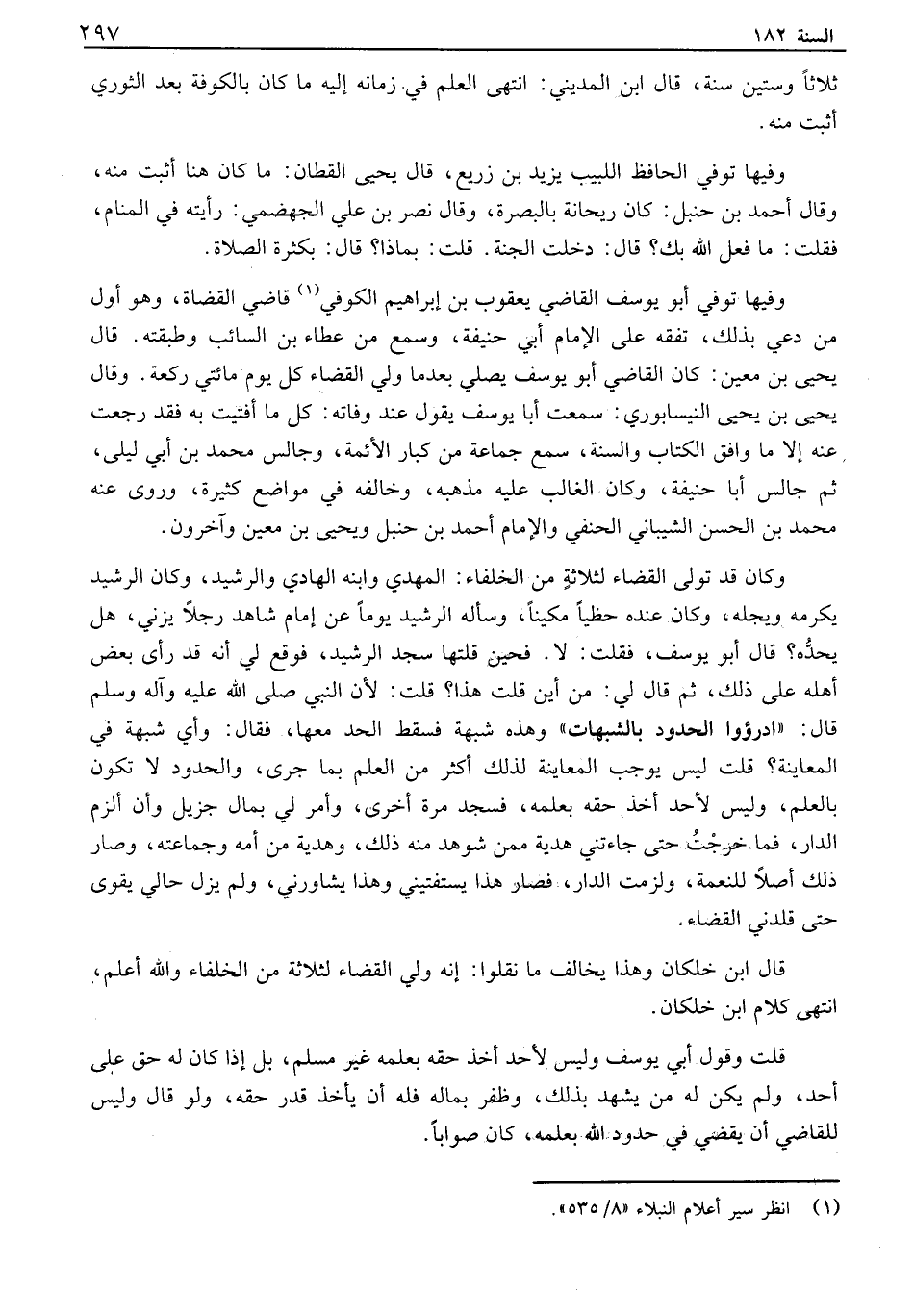 ثلاثا وستين سنة، قال ابن المديني: انتهى العلم في زمانه إليه ما كان بالكوفة بعد الثوري أثبت منه. وفيها توفي الحافظ اللبيب يزيد بن زريع، قال يحيى القطان: ما كان هنا أثبت منه، وقال أحمد بن حنبل: كان ريحانة بالبصرة، وقال نصر بن علي الجهضمي: رأيته في المنام، فقلت: ما فعل الله بك؟ قال: دخلت الجنة. قلت: بماذا؟ قال: بكثرة الصلاة. وفيها توفي أبو يوسف القاضي يعقوب بن إبراهيم الكوفي قاضي القضاة، وهو أول من دعي بذلك، تفقه على الإمام أبي حنيفة، وسمع من عطاء بن السائب وطبقته. قال يحيى بن معين: كان القاضي أبو يوسف يصلي بعدما ولي القضاء كل يوم مائتي ركعة. وقال يحيى بن يحيى الذيسابوري: سمعت أبا يوسف يقول عند وفاته: كل ما أفتيت به فقد رجعت عنه إلا ما وافق الكتاب والسنة، سمع جماعة من كبار الأئمة، وجالس محمد بن أبي ليلى، ثم جالس أبا حنيفة، وكان الغالب عليه مذهبه، وخالفه في مواضع كثيرة، وروى عنه محمد بن الحسن الشيباني الحنفي والإمام أحمد بن حنبل ويحيى بن معين وآخرون. وكان قد تولى القضاء لثلاثة من الخلفاء: المهدي وابنه الهادي والرشيد، وكان الرشيد يكرمه ويجله، وكان عنده حظياً مكيناً، وسأله الرشيد يوماً عن إمام شاهد رجلاً يزني، هل يحده؟ قال أبو يوسف، فقلت: لا. فحين قلتها سجد الرشيد، فوقع لي أنه قد رأى بعض أهله على ذلك، ثم قال لي: من أين قلت هذا؟ قلت: لأن النبي صلى الله عليه وآله وسلم قال: " ادرؤوا الحدود بالشبهات " وهذه شبهة فسقط الحد معها، فقال: وأي شبهة في المعاينة؟ قلت ليس يوجب المعاينة لذلك أكثر من العلم بما جرى، والحدود لا تكون بالعلم، وليس لأحد أخذ حقه بعلمه، فسجد مرة آخرى، وأمر لي بمال جزيل وأن ألزم الدار، فما خرجت حتى جاءتني هدية ممن شوهد منه ذلك، وهدية من أمه وجماعته، وصار ذلك أصلاً للنعمة، ولزمت الدار، فصار هذا يستفتيني وهذا يشاورني، ولم يزل حالي يقوى حتى قلدني القضاء. قال ابن خلكان وهذا يخالف ما نقلوا: انه ولي القضاء لثلاثة من الخلفاء والله أعلم، انتهى كلام ابن خلكان. قلت وقول أبي يوسف وليس لأحد أخذ حقه بعلمه غير مسلم، بل إذا كان له حق على أحد، ولم يكن له من يشهد بذلك، وظفر بماله فله أن يأخذ قدر حقه، ولو قال وليس للقاضي أن يقضي في حدود الله بعلمه، كان صواباً.