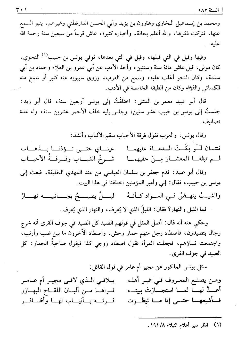 ومحمد بن إسماعيل البخاري وهارون بن يزيد وأبي الحسن الدارقطني وغيرهم، ينبو السمع عنها، فتركت ذكرها، والله أعلم بحالة، وأخباره كثيرة، عاش قريباً من سبعين سنة رحمة الله عليه. وفيها وقيل في التي قبلها، وقيل في التي بعدها، توفي يونس بن حبيب النحوي، كان مولى، قيل عاش مائة سنة وسنتين، وأخذ الأدب عن أبي عمرو بن العلاء وحماد بن أبي سلمة، وكان النحو أغلب عليه، وسمع من العرب، وروى سيبويه عنه كثير أو سمع منه الكسائي والفراء وكان من الطبقة الخامسة في الأدب. قال أبو عبيد معمربن المثنى: اختلفت إلى يونس أربعين سنة، قال أبو زيد: جلست إلى يونس بن حبيب عشر سنين، وجلس إليه خلف الأحمر عشرين سنة، وله عدة تصانيف. وقال يونس: والعرب تقول فرقة الأحباب سقم الألباب وأنشد: