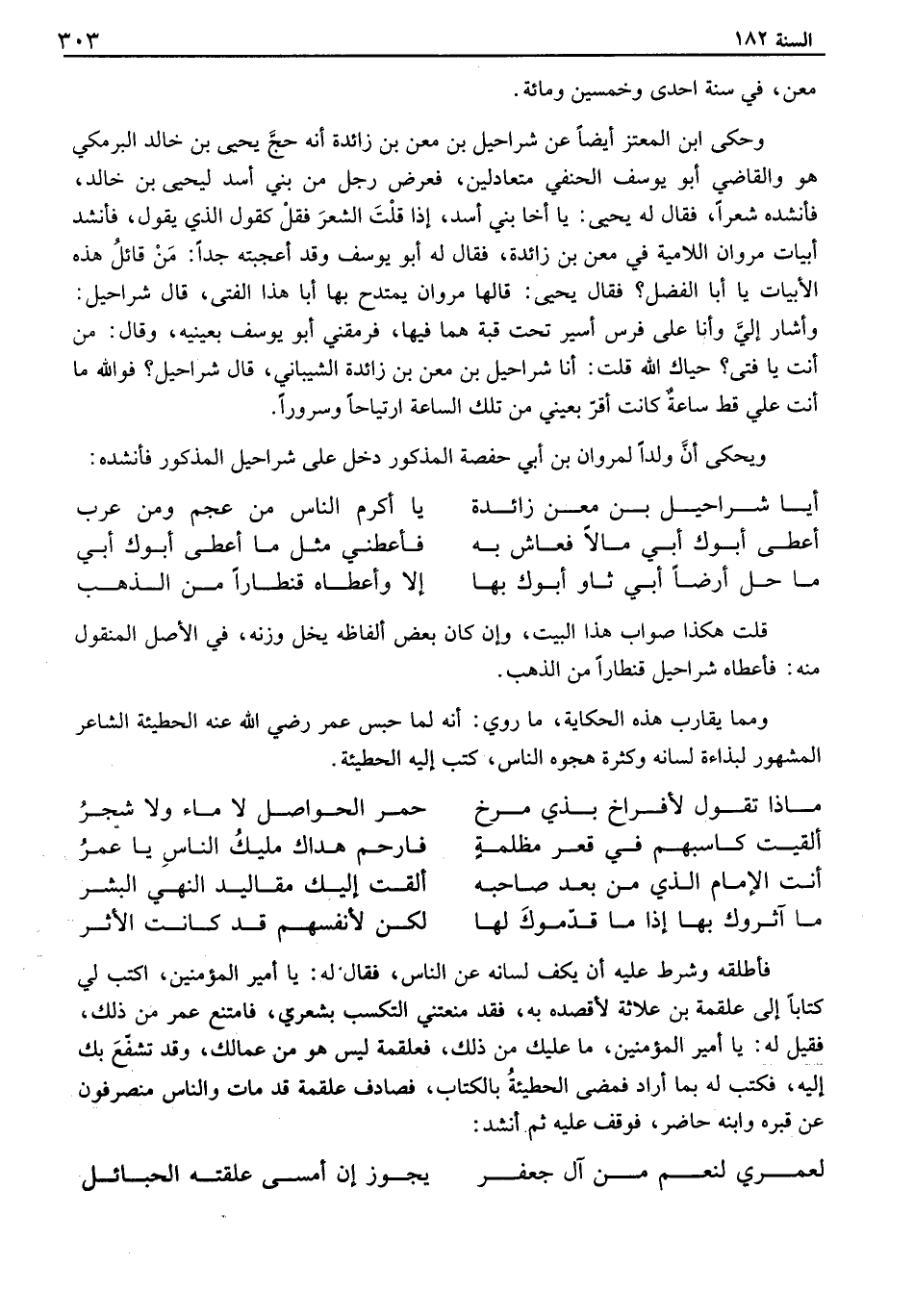 قلت هكذا صواب هذا البيت، وإن كان بعض ألفاظه يخل وزنه، في الأصل المنقول منه: فأعطاه شراحيل قنطاراً من الذهب. ومما يقارب هذه الحكاية، ما روي: انه لما حبس عمر رضي الله عنه الحطيئة الشاعر المشهور لبذاءة لسانه وكثرة هجوه الناس، كتب إليه الحطيئة.
