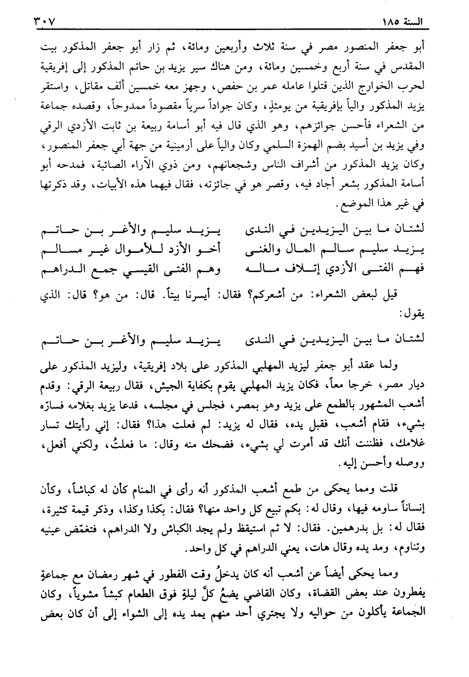 أبو جعفر المنصور مصر في سنة ثلاث وأربعين ومائة، ثم زار ابو جعفر المدكور بيت المقدس في سنة أربع وخمسين ومائة، ومن هناك سير يزيد بن حاتم المذكور إلى إفريقية لحرب الخوارج الذين قتلوا عامله عمر بن حفص، وجهز معه خمسين ألف مقاتل، واستقر يزيد المذكور والياً بإفريقية من يومئذ، وكان جواداً سرياً مقصوداً ممدوحاً، وقصده جماعة من الشعراء فأحسن جوائزهم، وهو الذي قال فيه أبو أسامة ربيعة بن ثابت الأزدي الرقي وفي يزيد بن أسيد بضم الهمزة السلمي وكان والياً على أرمينية من جهة أبي جعفر المنصور، وكان يزيد المذكور من أشراف الناس وشجعانهم، ومن ذوي الآراء الصائبة، فمدحه أبو أسامة المذكور بشعر أجاد فيه، وقصر هو في جائزته، فقال فيهما هذه الأبيات، وقد ذكرتها في غير هذا الموضع.