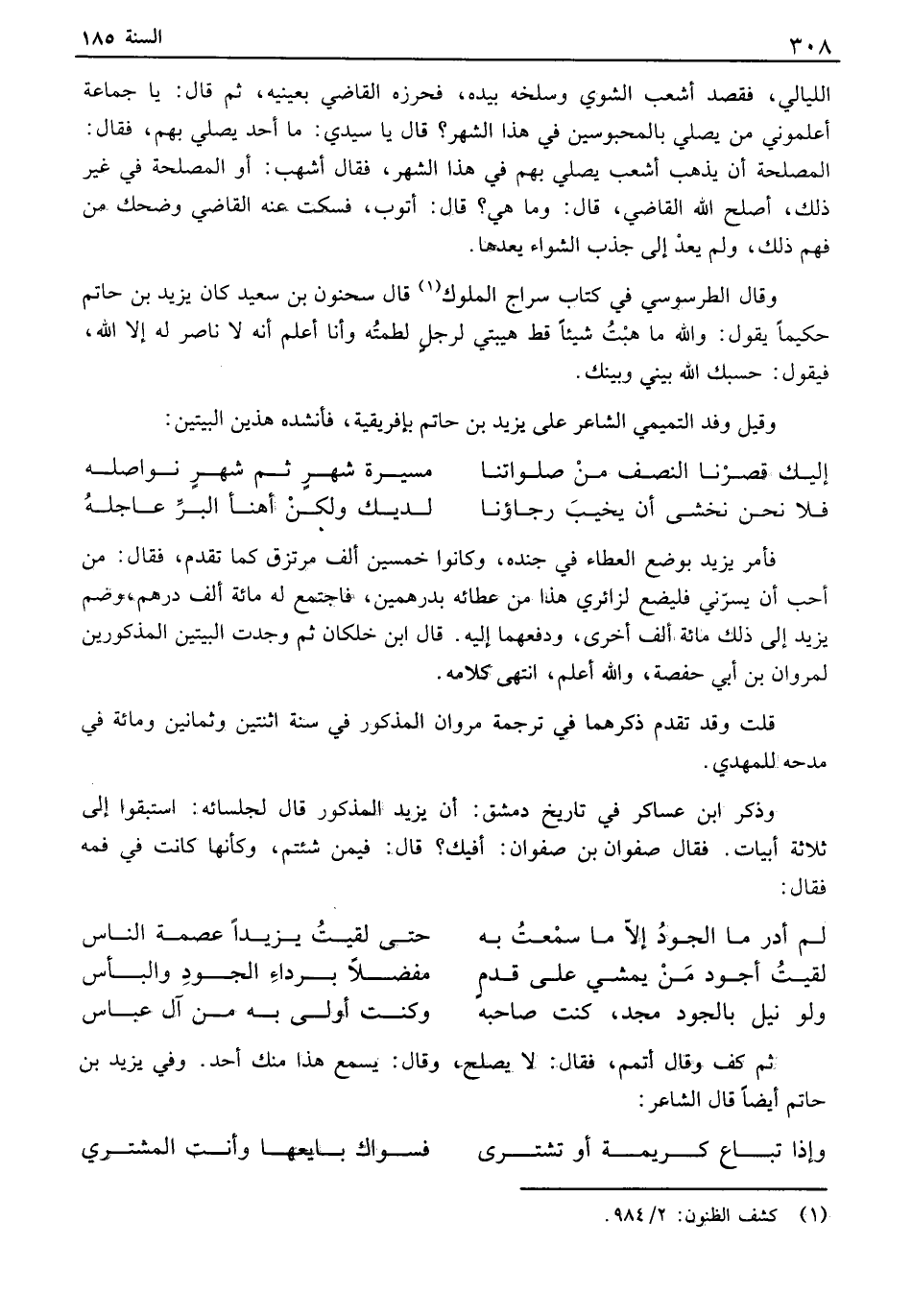 فأمريزيد بوضع العطاء في جنده، وكانوا خمسين ألف مرتزق كما تقدم، فقال: من أحب أن يسرني فليضع لزائري هذا من عطائه بدرهمين، فاجتمع له مائة ألف درهم، وضم يزيد إلى ذلك مائة ألف أخرى، ودفعهما إليه. قال ابن خلكان ثم وجدت البيتين المذكورين لمروان بن أبي حفصة، والله أعلم، انتهى كلامه. قلت وقد تقدم ذكرهما في ترجمة مروان المذكور في سنة اثنتين وثمانين ومائة في مدحه للمهدي. وذكر ابن عساكر في تاريخ دمشق: ان يزيد المذكور قال لجلسائه: استبقوا إلى ثلاثة أبيات. فقال صفوان بن صفوان: افيك؟ قال: فيمن شئتم، وكأنها كانت في فمه فقال: