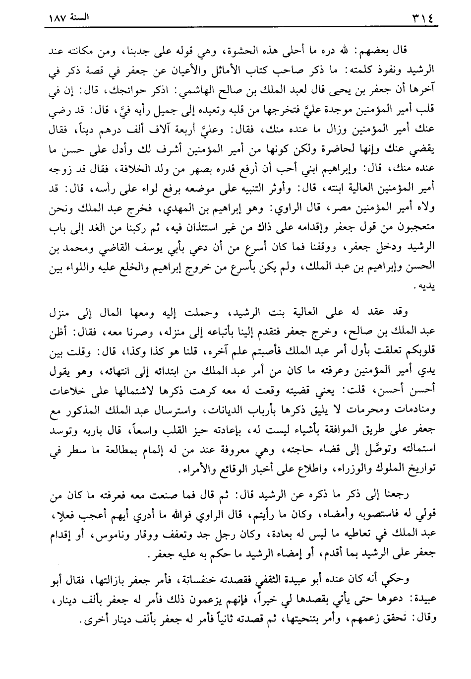 قال بعضهم: لله دره ما أحلى هذه الحشوة، وهي قوله على جدبنا، ومن مكانته عند الرشيد ونفوذ كلمته: ما ذكر صاحب كتاب الأماثل والأعيان عن جعفر في قصة ذكر في آخرها أن جعفر بن يحيى قال لعبد الملك بن صالح الهاشمي: اذكر حوائجك، قال: ان في قلب أمير المؤمنين موجدة علي فتخرجها من قلبه وتعيده إلى جميل رأيه في، قال: قد رضي عنك أمير المؤمنين وزال ما عنده منك، فقال: وعلي أربعة آلاف ألف درهم ديناً، فقال يقضي عنك وانها لحاضرة ولكن كونها من أمير المؤمنين أشرف لك وأدل على حسن ما عنده منك، قال: وإبراهيم ابني أحب أن أرفع قدره بصهر من ولد الخلافة، فقال قد زوجه أمير المؤمنين العالية ابنته، قال: وأوثر التنبيه على موضعه برفع لواء على رأسه، قال: قد ولاه أمير المؤمنين مصر، قال الراوي: وهو إبراهيم بن المهدي، فخرج عبد الملك ونحن متعجبون من قول جعفر وإقدامه على ذاك من غير استئذان فيه، ثم ركبنا من الغد إلى باب الرشيد ودخل جعفر، ووقفنا فما كان أسرع من أن دعي بأبي يوسف القاضي ومحمد بن الحسن وإبراهيم بن عبد الملك، ولم يكن بأسرع من خروج إبراهيم والخلع عليه واللواء بين يديه. وقد عقد له على العالية بنت الرشيد، وحملت إليه ومعها المال إلى منزل عبد الملك بن صالح، وخرج جعفر فتقدم إلينا بأتباعه إلى منزله، وصرنا معه، فقال: اظن قلوبكم تعلقت بأول أمر عبد الملك فأصبتم علم آخره، قلنا هو كذا وكذا، قال: وقلت بين يدي أمير المؤمنين وعرفته ما كان من أمر عبد الملك من ابتدائه إلى انتهائه، وهو يقول أحسن أحسن، قلت: يعني قضيته وقعت له معه كرهت ذكرها لاشتمالها على خلاعات ومنادمات ومحرمات لا يليق ذكرها بأرباب الديانات، واسترسال عبد الملك المذكور مع جعفر على طريق المو فقة بأشياء ليست له، بإعادته حيز القلب واسعاً، قال باريه وتوسد استمالته وتوصل إلى قضاء حاجته، وهي معروفة عند من له إلمام بمطالعة ما سطر في تواريخ الملوك والوزراء، واطلاع على أخبار الوقائع والأمراء. رجعنا إلى ذكر ما ذكره عن الرشيد قال: ثم قال فما صنعت معه فعرفته ما كان من قولي له فاستصوبه وأمضاه، وكان ما رأيتم، قال الراوي فوالله ما أدري أيهم أعجب فعلا، عبد الملك في تعاطيه ما ليس له بعادة، وكان رجل جد وتعفف ووقار وناموس، او إقدام جعفر على الرشيد بما أقدم، او إمضاء الرشيد ما حكم به عليه جعفر. وحكي أنه كان عنده أبو عبيدة الثقفي فقصدته خنفساتة، فأمر جعفر بازالتها، فقال أبو عبيدة: دعوها حتى يأتي بقصدها لي خيراً، فإنهم يزعمون ذلك فأمر له جعفر بألف دينار، وقال: تحقق زعمهم، وأمر بتنحيتها، ثم قصدته ثانياً فأمر له جعفر بألف دينار أخرى.
