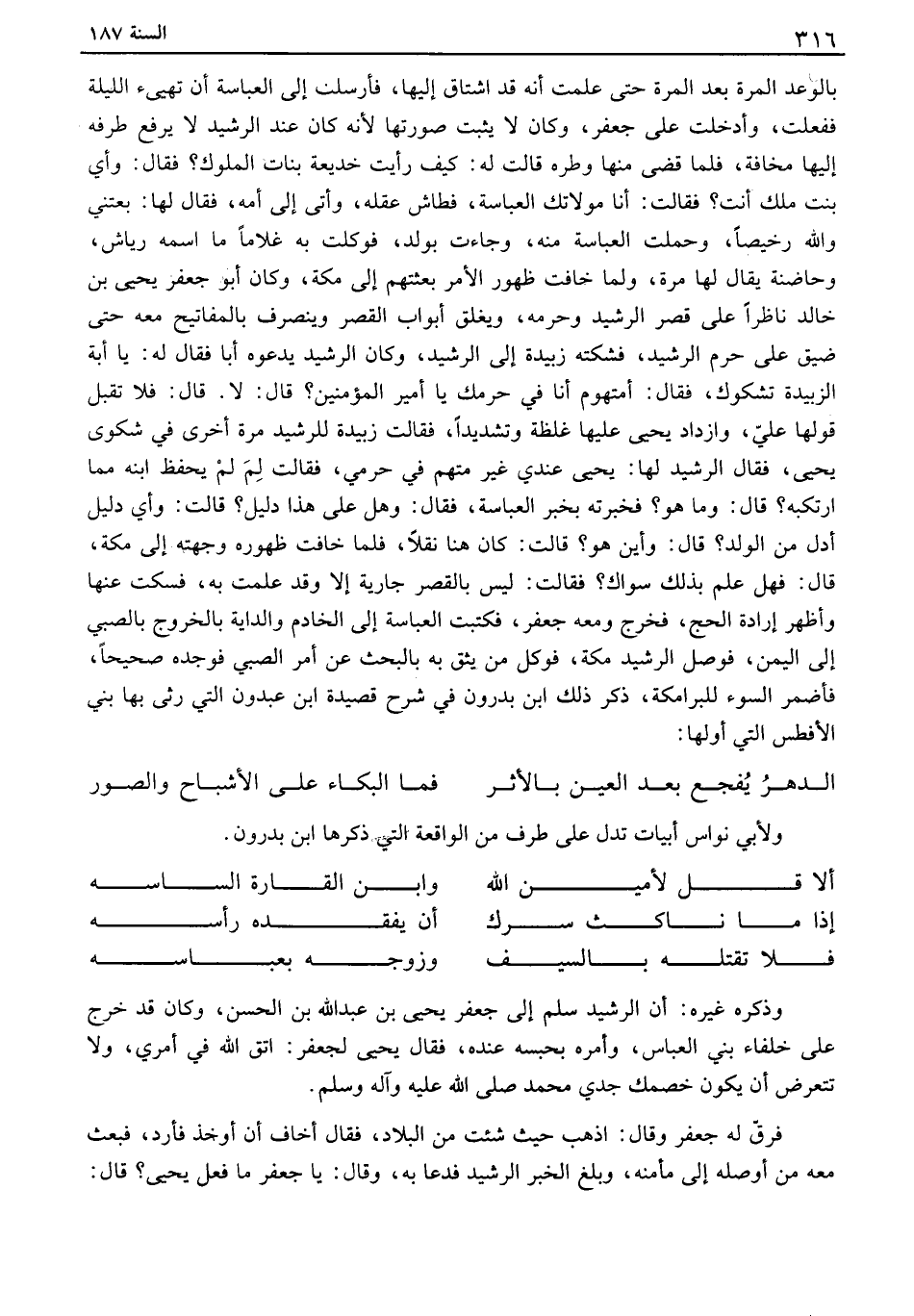 بالوعد المرة بعد المرة حتى علمت أنه قد اشتاق اليها، فأرسلت إلى العباسة أن تهيىء الليلة ففعلت، وأدخلت على جعفر، وكان لا يثبت صورتها لأنه كان عند الرشيد لا يرفع طرفه إليها مخافة، فلما قضى منها وطره قالت له: كيف رأيت خديعة بنات الملوك؟ فقال: وأي بنت ملك أنت؟ فقالت: انا مولاتك العباسة، فطاش عقله، وأتى إلى أمه، فقال لها: بعتني والله رخيصاً، وحملت العباسة منه، وجاءت بولد، فوكلت به غلاماً ما اسمه رياش، وحاضنة يقال لها مرة، ولما خافت ظهور الأمر بعثتهم إلى مكة، وكان أبو جعفر يحيى بن خالد ناظراً على قصر الرشيد وحرمه، ويغلق أبواب القصر وينصرف بالمفاتيح معه حتى ضيق على حرم الرشيد، فشكته زبيدة إلى الرشيد، وكان الرشيد يدعوه أبا فقال له: يا أبة الزبيدة تشكوك، فقال: امتهوم أنا في حرمك يا أمير المؤمنين؟ قال: لا. قال: فلا تقبل قولها علي، وازداد يحيى عليها غلظة وتشديداً، فقالت زبيدة للرشيد مرة أخرى في شكوى يحيى، فقال الرشيد لها: يحيى عندي غير متهم في حرمي، فقالت لم لم يحفظ ابنه مما ارتكبه؟ قال: وما هو؟ فخبرته بخبر العباسة، فقال: وهل على هذا دليل؟ قالت: وأي دليل أدل من الولد؟ قال: وأين هو؟ قالت: كان هنا نقلاً، فلما خافت ظهوره وجهته إلى مكة، قال: فهل علم بذلك سواك؟ فقالت: ليس بالقصر جارية إلا وقد علمت به، فسكت عنها وأظهر إرادة الحج، فخرج ومعه جعفر، فكتبت العباسة إلى الخادم والداية بالخروج بالصبي إلى اليمن، فوصل الرشيد مكة، فوكل من يثق به بالبحث عن أمر الصبي فوجده صحيحاً، فأضمر السوء للبرامكة، ذكر ذلك ابن بدرون في شرح قصيدة ابن عبدون التي رثى بها بني الأفطس التي أولها: