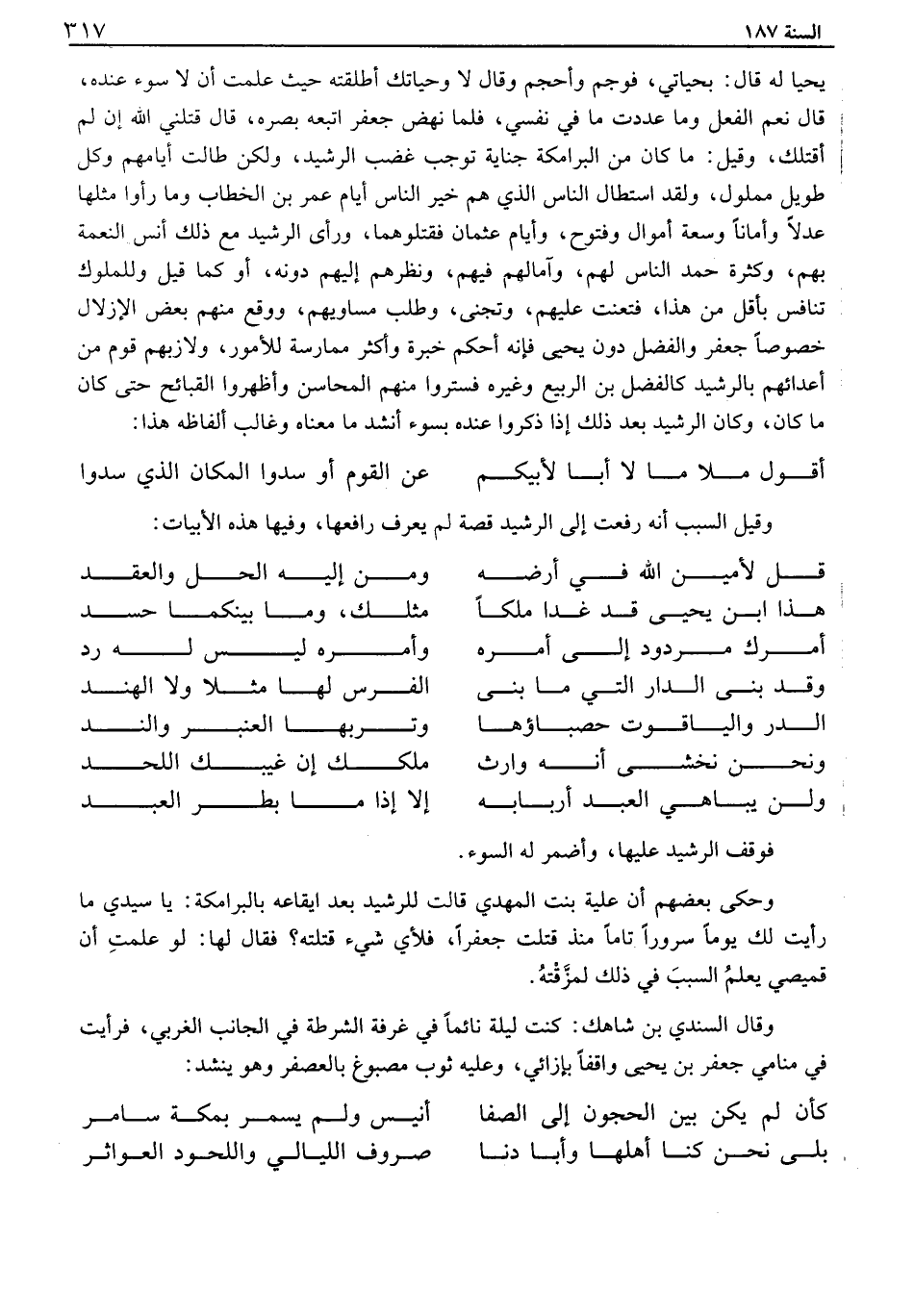 يحيا له قال: بحياتي، فوجم وأحجم وقال لا وحياتك أطلقته حيث علمت أن لا سوء عنده، قال نعم الفعل وما عددت ما في نفسي، فلما نهض جعفر اتبعه بصره، قال قتلني الله إن لم أقتلك، وقيل: ما كان من البرامكة جناية توجب غضب الرشيد، ولكن طالت أيامهم وكل طويل مملول، ولقد استطال الناس الذي هم خير الناس أيام عمر بن الخطاب وما رأوا مثلها عدلاً وأماناً وسعة أموال وفتوح، وأيام عثمان فقتلوهما، ورأى الرشيد مع ذلك أنس النعمة بهم، وكثرة حمد الناس لهم، وآمالهم فيهم، ونظرهم إليهم دونه، او كما قيل وللملوك تنافس بأقل من هذا، فتعنت عليهم، وتجنى، وطلب مساويهم، ووقع منهم بعض الإزلال خصوصاً جعفر والفضل دون يحيى فإنه أحكم خبرة وأكثر ممارسة للأمور، ولاز بهم قوم من أعدائهم بالرشيد كالفضل بن الربيع وغيره فستروا منهم المحاسن وأظهروا القبائح حتى كان ما كان، وكان الرشيد بعد ذلك إذا ذكروا عنده بسوء أنشد ما معناه وغالب ألفاظه هذا: