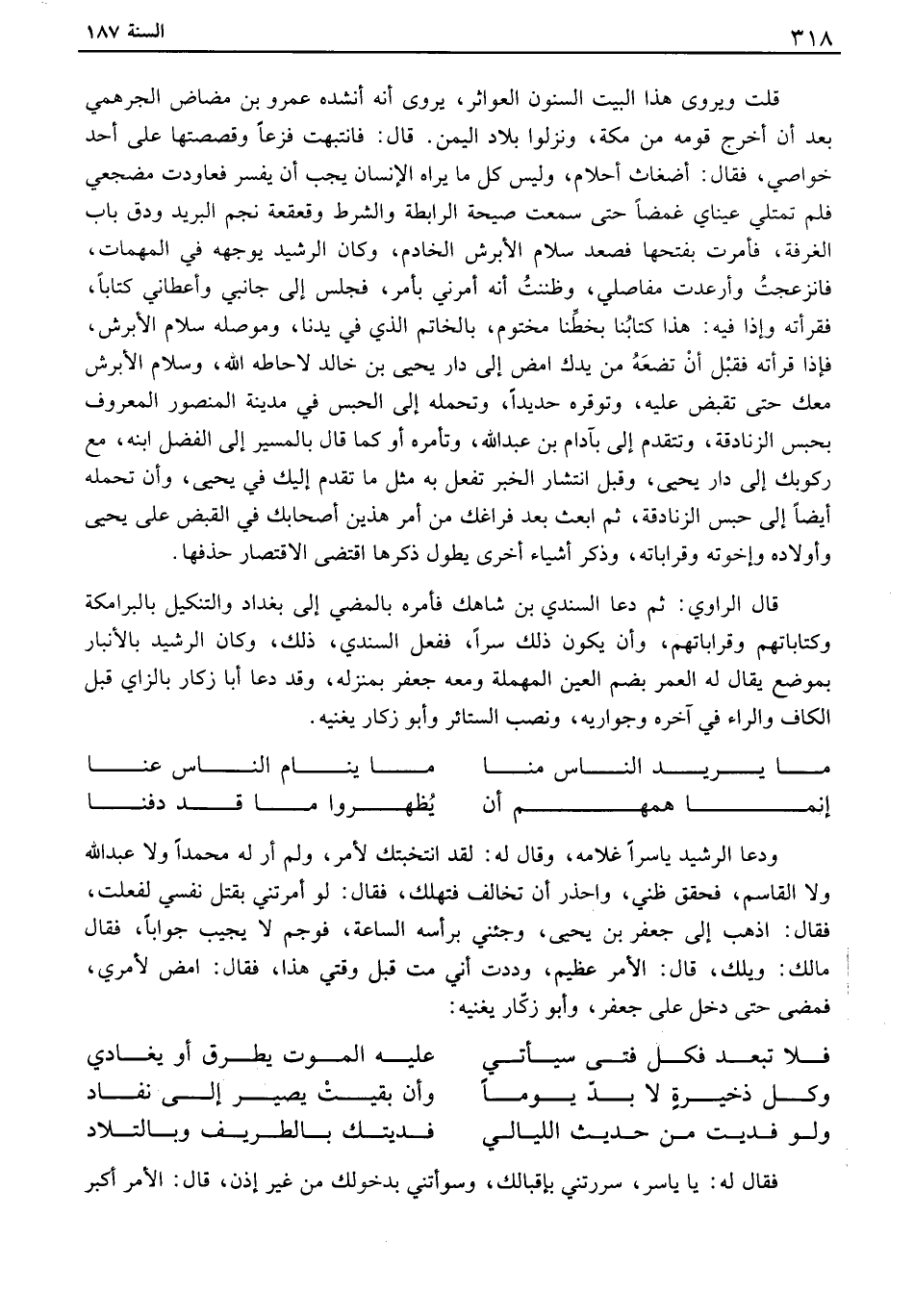 قلت ويروى هذا البيت السنون العواثر، يروى أنه أنشده عمرو بن مضاض الجرهمي بعد أن أخرج قومه من مكة، ونزلوا بلاد اليمن. قال: فانتبهت فزعاً وقصصتها على أحد خواصي، فقال: اضغاث أحلام، وليس كل ما يراه الإنسان يجب أن يفسر فعاودت مضجعي فلم تمتلي عيناي غمضاً حتى سمعت صيحة الرابطة والشرط وقعقعة نجم البريد ودق باب الغرفة، فأمرت بفتحها فصعد سلام الأبرش الخادم، وكان الرشيد يوجهه في المهمات، فانزعجت وأرعدت مفاصلي، وظننت أنه أمرني بأمر، فجلس إلى جانبي وأعطاني كتابأ، فقرأته وإذا فيه: هذا كتابنا بخطنا مختوم، بالخاتم الذي في يدنا، وموصله سلام الأبرش، فإذا قرأته فقبل أن تضعه من يدك امض إلى دار يحيى بن خالد لاحاطه الله، وسلام الأبرش معك حتى تقبض عليه، وتوقره حديداً، وتحمله إلى الحبس في مدينة المنصور المعروف بحبس الزنادقة، وتتقدم إلى بآدام بن عبد الله، وتأمره أو كما قال بالمسير إلى الفضل ابنه، مع ركوبك إلى دار يحيى، وقبل انتشار الخبر تفعل به مثل ما تقدم إليك في يحيى، وأن تحمله أيضا إلى حبس الزنادقة، ثم ابعث بعد فراغك من أمر هذين أصحابك في القبض على يحيى وأولاده وإخوته وقراباته، وذكر أشياء أخرى يطول ذكرها اقتضى الاقتصار حذفها. قال الراوي: ثم دعا السندي بن شاهك فأمره بالمضي إلى بغداد والتنكيل بالبرامكة وكتاباتهم وقراباتهم، وأن يكون ذلك سراً، ففعل السندي، ذلك، وكان الرشيد بالأنبار بموضع يقال له العمر بضم العين المهملة ومعه جعفر بمنزله، وقد دعا أبا زكار بالزاي قبل الكاف والراء في آخره وجواريه، ونصب الستائر وأبو زكار يغنيه.