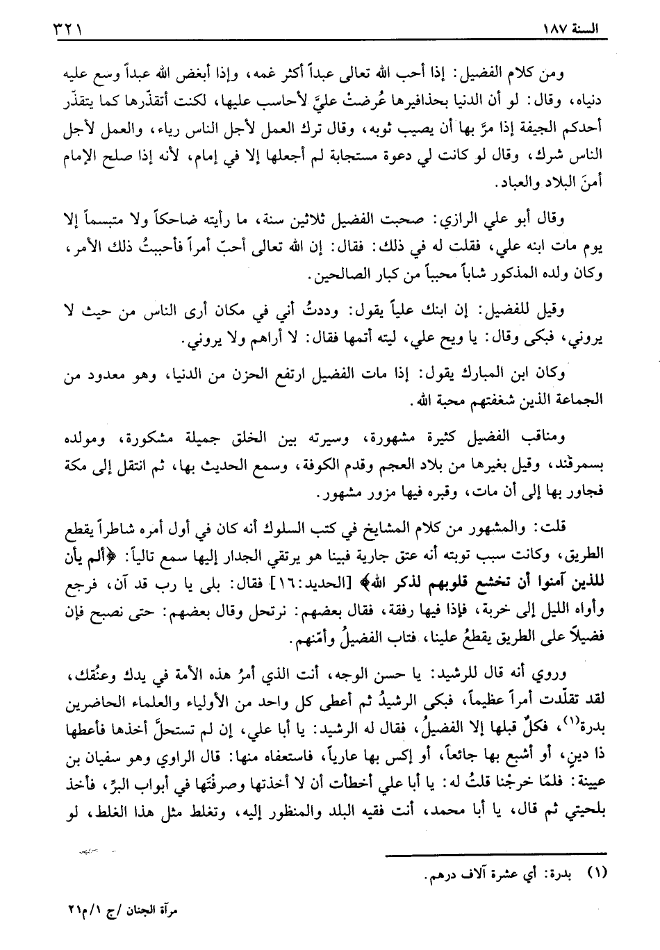 ومن كلام الفضيل: اذا أحب الله تعالى عبداً أكثر غمه، وإذا أبغض الله عبداً وسع عليه دنياه، وقال: لو أن الدنيا بحذافيرها عرضت علي لأحاسب عليها، لكنت أتقذرها كما يتقذر أحدكم الجيفة إذا مر بها أن يصيب ثوبه، وقال ترك العمل لأجل الناس رياء، والعمل لأجل الناس شرك، وقال لو كانت لي دعوة مستجابة لم أجعلها إلا في إمام، لأنه إذا صلح الامام أمن البلاد والعباد. وقال أبو علي الرازي: صحبت الفضيل ثلاثين سنة، ما رأيته ضاحكاً ولا متبسماً الا يوم مات ابنه علي، فقلت له في ذلك: فقال: ان الله تعالى أحب أمراً فأحببت ذلك الأمر، وكان ولده المذكور شاباً محبباً من كبار الصالحين. وقيل للفضيل: ان ابنك علياً يقول: وددت أني في مكان أرى الناس من حيث لا يروني، فبكى وقال: يا ويح علي، ليته أتمها فقال: لا أراهم ولا يروني. وكان ابن المبارك يقول: اذا مات الفضيل ارتفع الحزن من الدنيا، وهو معدود من الجماعة الذين شغفتهم محبة الله. ومناقب الفضيل كثيرة مشهورة، وسيرته بين الخلق جميلة مشكورة، ومولده بسمرقند، وقيل بغيرها من بلاد العجم وقدم الكوفة، وسمع الحديث بها، ثم انتقل إلى مكة فجاور بها إلى أن مات، وقبره فيها مزور مشهور. قلت: والمشهور من كلام المشايخ في كتب السلوك أنه كان في أول أمره شاطراً يقطع الطريق، وكانت سبب توبته أنه عتق جارية فبينا هو يرتقي الجدار إليها سمع تالياً: " ألم يأن للذين آمنوا أن تخشع قلوبهم لذكر ال " - الحديد: 16 - فقال: بلى يا رب قد آن، فرجع وأواه الليل إلى خربة، فاذا فيها رفقة، فقال بعضهم: نرتحل وقال بعضهم: حتى نصبح فان فضيلاً على الطريق يقطع علينا، فتاب الفضيل وأمنهم. وروي أنه قال للرشيد: يا حسن الوجه، انت الذي أمر هذه الأمة في يدك وعنقك