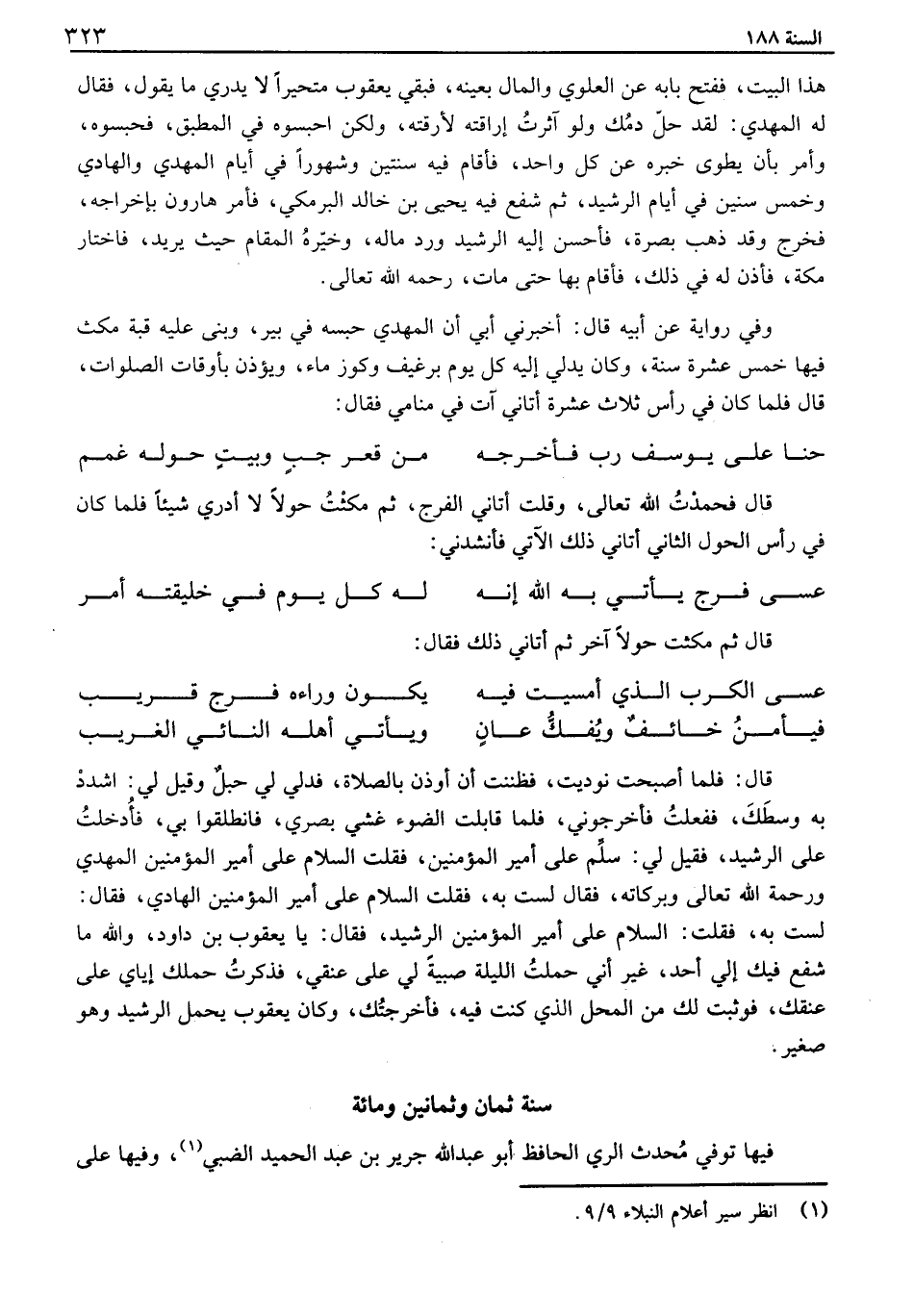 فيها توفي محدث الري الحافظ أبو عبد الله جرير بن عبد الحميد الضبي، وفيها على