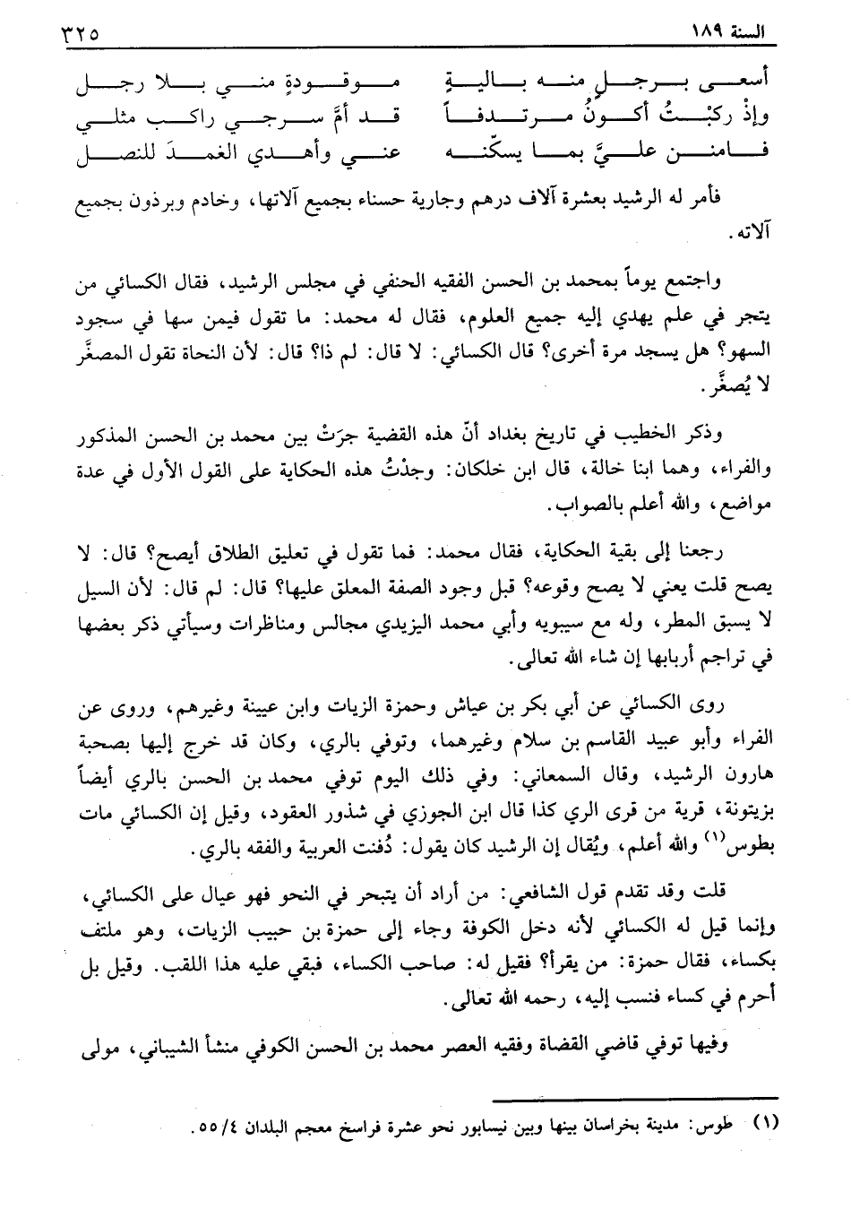 وذكر الخطيب في تاريخ بغداد أن هذه القضية جرت بين محمد بن الحسن المذكو والفراء، وهما ابنا خالة، قال ابن خلكان: وجدت هذه الحكاية على القول الأول في عدة مواضع، والله أعلم بالصواب. رجعنا إلى بقية الحكاية، فقال محمد: فما تقول في تعليق الطلاق أيصح؟ قال: لا يصح قلت يعني لا يصح وقوعه؟ قبل وجود الصفة المعلق عليها؟ قال: لم قال: لأن السيل لا يسبق المطر، وله مع سيبويه وأبي محمد اليزيدي مجالس ومناظرات وسيأتي ذكر بعضها في تراجم أربابها إن شاء الله تعالى. روى الكسائي عن أبي بكر بن عياش وحمزة الزيات وابن عيينة وغيرهم، وروى عن الفراء وأبو عبيد القاسم بن سلام وغيرهما، وتوفي بالري، وكان قد خرج إليها بصحبة هارون الرشيد، وقال السمعاني: وفي ذلك اليوم توفي محمد بن الحسن بالري أيضاً بزيتونة، قرية من قرى الري كذا قال ابن الجوزي في شذور العقود، وقيل إن الكسائي مات بطوس والله أعلم، ويقال إن الرشيد كان يقول: دفنت العربية والفقه بالري. قلت وقد تقدم قول الشافعي: من أراد أن يتبحر في النحو فهو عيال على الكسائي، وإنما قيل له الكسائي لأنه دخل الكوفة وجاء إلى حمزة بن حبيب الزيات، وهو ملتف بكساء، فقال حمزة: من يقرأ؟ فقيل له: صاحب الكساء، فبقي عليه هذا اللقب. وقيل بل أحرم في كساء فنسب إليه، رحمه الله تعلى. وفيها توفى قاضي القضاة وفقيه العصر محمد بن الحسن الكوفي منشأ الشيباني، مولى