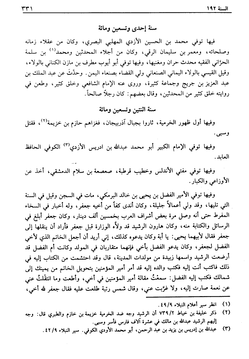 وفيها أول ظهور الخرمية، ثاروا بجبال آذربيجان، فغزاهم حازم بن خزيمة، فقتل وسبى. وفيها توفي الإمام الكبير أبو محمد عبد الله بن ادريس الأزدي الكوفي الحافظ العابد. وفيها توفي مفتي الأندلس وخطيب قرطبة، صعصعة بن سلام الدمشقي، اخذ عن الأوزاعي والكبار. وفيها توفي الأمير الفضل بن يحيى بن خالد البرمكي، مات في السجن وقيل في السنة التي تليها، وقد ولي أعمالاً جليلة، وكان أندى كفاً من أخيه جعفر، وله أخبار في السخاء المفرط حتى أنه وصل مرة بعض أشراف العرب بخمسين ألف دينار، وكان جعفر أبلغ في الرسائل والكتابة منه، وكان هارون الرشيد قد ولاه الوزارة قبل جعفر فأراد أن ينقلها إلى جعفر فقال لأبيهما يحيى: يا أبة وكان يدعوه كذلك، اني أريد أن أجعل الخاتم الذي لأخي الفضل لجعفر، وكان يدعو الفضل بأخي فإنهما متقاربان في المولد وكانت أم الفضل قد أرضعت الرشيد واسمها زبيدة من مولدات المدينة، قال وقد احتشمت من الكتاب إليه في ذلك فاكتب أنت إليه فكتب والده إليه قد أمر أمير المؤمنين بتحويل الخاتم من يمينك إلى شمالك فكتب إليه الفضل: سمعت مقالة أمير المؤمنين في أخي، وأطعت وما انتقلت عني عن نعمة صارت إليه، ولا غربت عنى، وقال شمس رتبة طلعت عليه فقال جعفر لله أخي،