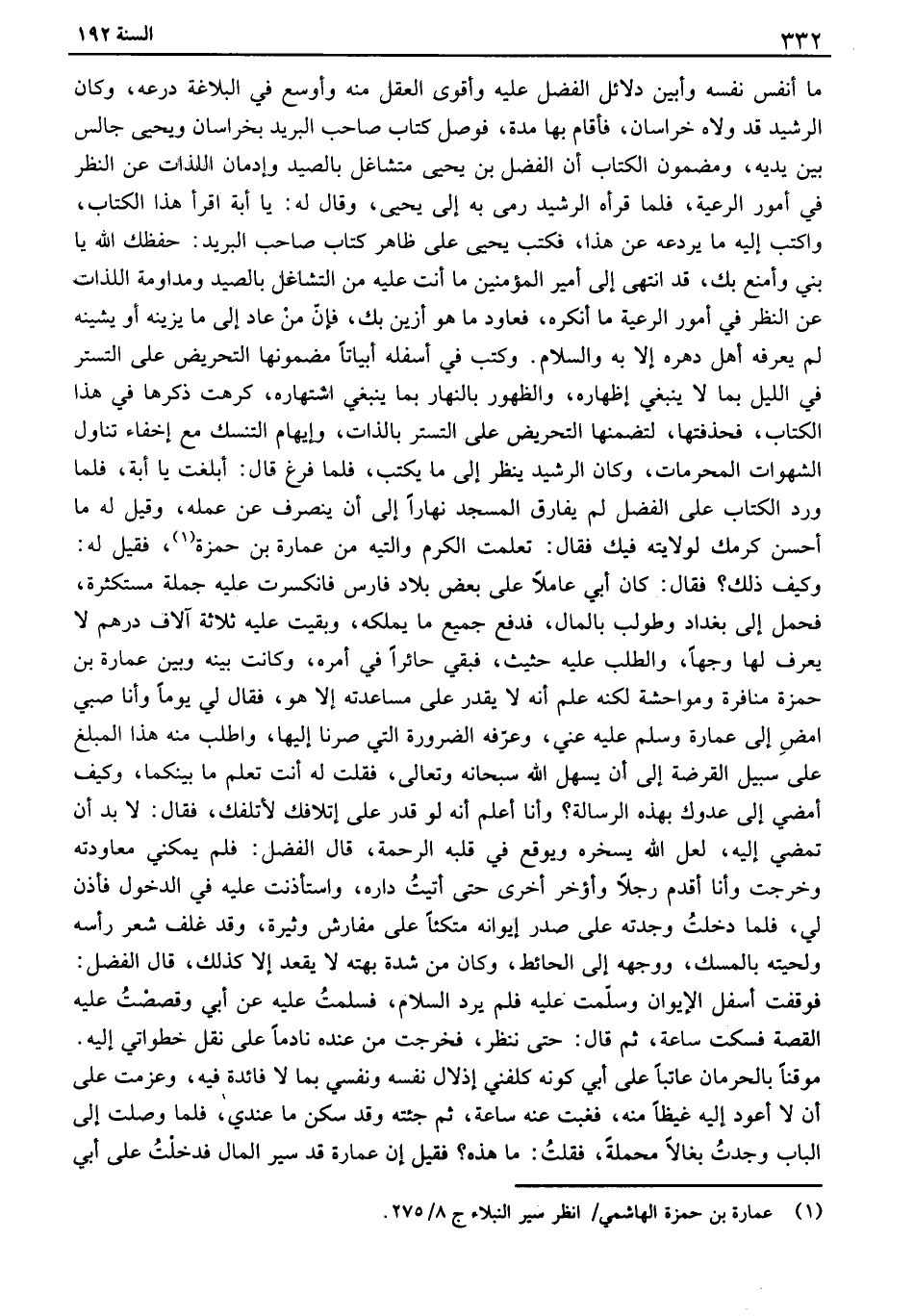 ما أنفس نفسه وأبين دلائل الفضل عليه وأقوى العقل منه وأوسع في البلاغة درعه، وكان الرشيد قد ولاه خراسان، فأقام بها مدة، فوصل كتاب صاحب البريد بخراسان ويحيى جالس بين يديه، ومضمون الكتاب أن الفضل بن يحيى متشاغل بالصيد وإدمان اللذات عن النظر في أمور الرعية، فلما قرأه الرشيد رمى به إلى يحيى، وقال له: يا أبة اقرأ هذا الكتاب، واكتب إليه ما يردعه عن هذا، فكتب يحيى على ظاهر كتاب صاحب البريد: حفظك الله يا بني وأمنع بك، قد انتهى إلى أمير المؤمنين ما أنت عليه من التشاغل بالصيد ومداومة اللذات عن النظر في أمور الرعية ما أنكره، فعاود ما هو أزين بك، فإن من عاد إلى ما يزينه أو يشينه لم يعرفه أهل دهره إلا به والسلام. وكتب في أسفله أبياتاً مضمونها التحريض على التستر في الليل بما لا ينبغي إظهاره، والظهور بالنهار بما ينبغي اشتهاره، كرهت ذكرها في هذا الكتاب، فحذفتها، لتضمنها التحريض على التستر بالذات، وإيهام التنسك مع إخفاء تناول الشهوات المحرمات، وكان الرشيد ينظر إلى ما يكتب، فلما فرغ قال: ابلغت يا أبة، فلما ورد الكتاب على الفضل لم يفارق المسجد نهاراً إلى أن ينصرف عن عمله، وقيل له ما أحسن كرمك لولايته فيك فقال: تعلمت الكرم والتيه من عمارة بن حمزة، فقيل له: وكيف ذلك؟ فقال: كان أبي عاملاً على بعض بلاد فارس فانكسرت عليه جملة مستكثرة، فحمل إلى بغداد وطولب بالمال، فدفع جميع ما يملكه، وبقيت عليه ثلاثة آلاف درهم لا يعرف لها وجهاً، والطلب عليه حثيث، فبقي حائراً في أمره، وكانت بينه وبين عمارة بن حمزة منافرة ومواحشة لكنه علم أنه لا يقدر على مساعدته إلا هو، فقال لي يوماً وأنا صبي امض إلى عمارة وسلم عليه عني، وعرفه الضرورة التي صرنا إليها، واطلب منه هذا المبلغ على سبيل القرضة إلى أن يسهل الله سبحانه وتعالى، فقلت له أنت تعلم ما بينكما، وكيف أمضي إلى عدوك بهذه الرسالة؟ وأنا أعلم أنه لو قدر على إتلافك لأتلفك، فقال: لا بد أن تمضي إليه، لعل الله يسخره ويوقع في قلبه الرحمة، قال الفضل: فلم يمكني معاودته وخرجت وأنا أقدم رجلاً وأؤخر أخرى حتى أتيت داره، واستأذنت عليه في الدخول فأذن لي، فلما دخلت وجدته على صدر إيوانه متكئاً على مفارش وثيرة، وقد غلف شعر رأسه ولحيته بالمسك، ووجهه إلى الحائط، وكان من شدة بهته لا يقعد إلا كذلك، قال الفضل: فوقفت أسفل الإيوان وسلمت عليه فلم يرد السلام، فسلمت عليه عن أبي وقصصت عليه القصة فسكت ساعة، ثم قال: حتى ننظر، فخرجت من عنده نادماً على نقل خطواتي إليه. موقناً بالحرمان عاتباً على أبي كونه كلفني إذلال نفسه ونفسي بما لا فائدة فيه، وعزمت على أن لا أعود إليه غيظاً منه، فغبت عنه ساعة، ثم جئته وقد سكن ما عندي، فلما وصلت إلى الباب وجدت بغالاً محملة، فقلت: ما هذه؟ فقيل إن عمارة قد سير المال فدخلت على أبي