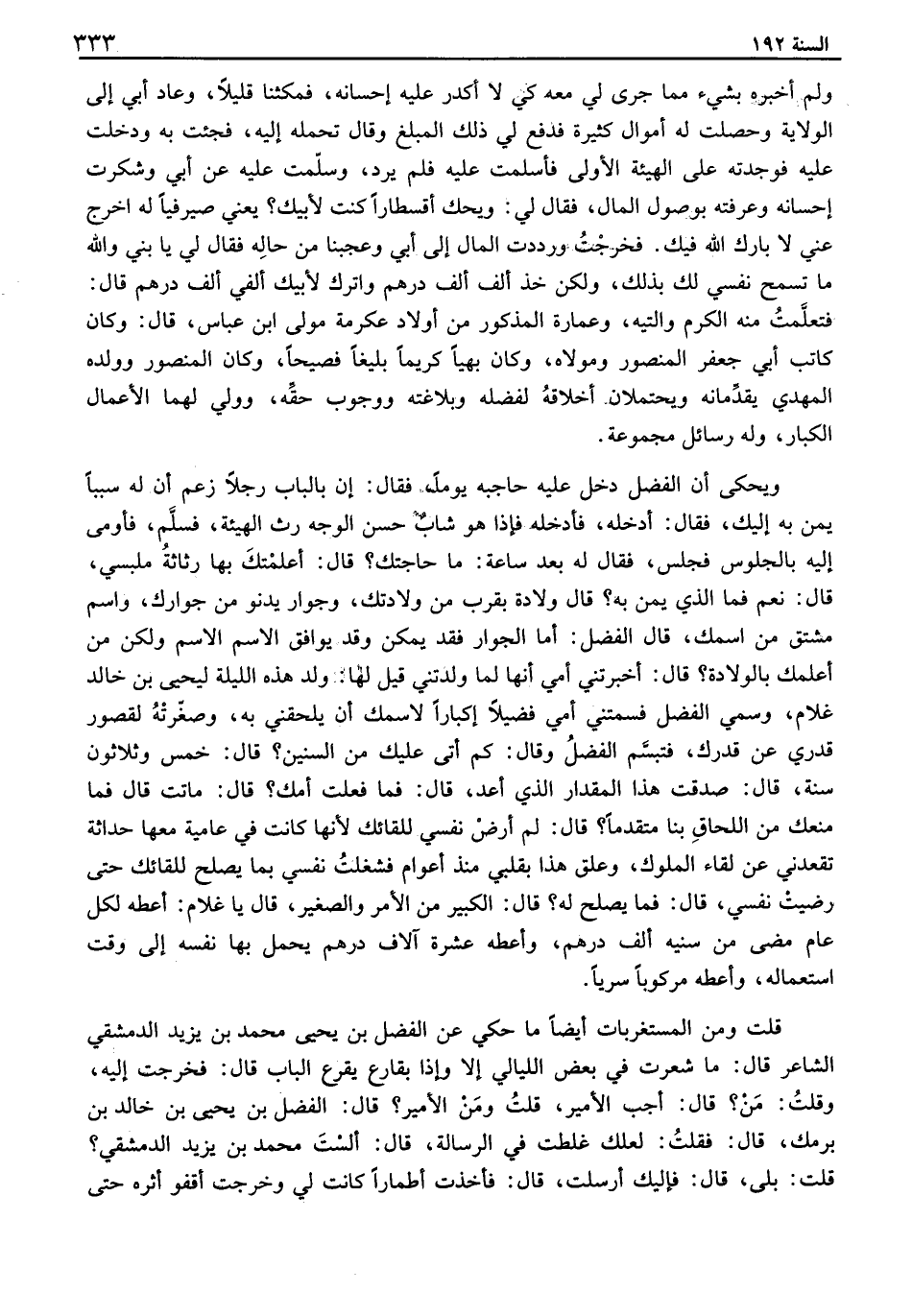 عليه عن أبي وشكرت إحسانه وعرفته بوصول المال، فقال لي: ويحك أقسطاراً كنت لأبيك؟ يعني صيرفياً له اخرج عني لا بارك الله فيك. فخرجت ورددت المال إلى أبي وعجبنا من حاله فقال لي يا بني والله ما تسمح نفسي لك بذلك، ولكن خذ ألف ألف درهم واترك لأبيك ألفي ألف درهم قال: فتعلمت منه الكرم والتيه، وعمارة المذكور من أولاد عكرمة مولى ابن عباس، قال: وكان كاتب أبي جعفر المنصور ومولاه، وكان بهياً كريماً بليغاً فصيحاً، وكان المنصور وولده المهدي يقدمانه ويحتملان أخلاقه لفضله وبلاغته ووجوب حقه، وولي لهما الأعمال الكبار، وله رسائل مجموعة. ويحكى أن الفضل دخل عليه حاجبه يوماً، فقال: ان بالباب رجلاً زعم أن له سبباً يمن به إليك، فقال: ادخله، فأدخله فإذا هو شاب حسن الوجه رث الهيئة، فسفم، فأومى إليه بالجلوس فجلس، فقال له بعد ساعة: ما حاجتك؟ قال: اعلمتك بها رثاثة ملبسي، قال: نعم فما الذي يمن به؟ قال ولادة بقرب من ولادتك، وجوار يدنو من جوارك، واسم مشتق من اسمك، قال الفضل: اما الجوار فقد يمكن وقد يوافق الاسم الاسم ولكن من أعلمك بالولادة؟ قال: اخبرتني أمي أنها لما ولدتني قيل لها: ولد هذه الليلة ليحيى بن خالد غلام، وسمي الفضل فسمتني أمي فضيلاً إكباراً لاسمك أن يلحقني به، وصغرته لقصور قدري عن قدرك، فتبسم الفضل وقال: كم أتى عليك من السنين؟ قال: خمس وثلاثون سنة، قال: صدقت هذا المقدار الذي أعد، قال: فما فعلت أمك؟ قال: ماتت قال فما منعك من اللحاق بنا متقدماً؟ قال: لم أرض نفسي للقائك لأنها كانت في عامية معها حداثة تقعدني عن لقاء الملوك، وعلق هذا بقلبي منذ أعوام فشغلت نفسي بما يصلح للقائك حتى رضيت نفسي، قال: فما يصلح له؟ قال: الكبير من الأمر والصغير، قال يا غلام: اعطه لكل عام مضى من سنيه ألف درهم، وأعطه عشرة آلاف درهم يحمل بها نفسه إلى وقت استعماله، وأعطه مركوباً سرياً. قلت ومن المستغربات أيضاً ما حكي عن الفضل بن يحيى محمد بن يزيد الدمشقي الشاعر قال: ما شعرت في بعض الليالي إلا وإذا بقارع يقرع الباب قال: فخرجت إليه، وقلت: من؟ قال: اجب الأمير، قلت ومن الأمير؟ قال: الفضل بن يحيى بن خالد بن برمك، قال: فقلت: لعلك غلطت في الرسالة، قال: الست محمد بن يزيد الدمشقي؟ قلت: بلى، قال: فإليك أرسلت، قال: فأخذت أطماراً كانت لي وخرجت أقفو أثره حتى وصل بي إلى دار فأجلسني على بابها وقال: اجلس يا محمد حتى أخرج إليك. قال: فما لبثت إلا يسيراً حتى خرج وقال: ادخل يا محمد فدخلت وطلعت فإذا أنا بمكان واسع وفوقه مرتبة وجمع كثير فيهم يحيى بن خالد والفضل وجعفر وسائر أهل الدولة. قال: فأخرج مولود من باب عن يمين الفضل، وكانت ليلة سابعة ولا علم لي به، فأقبلوا يقرؤون ومجامر الندى تختلف بينهم، والشماع المعنبرة تضيء بأيدي الخدم، فلما فرغوا من ختمتهم قام الشعراء، كل يهنيه بطلعته ويبشره برؤيته، فنثرت عليهم الدنانير مطيبة بالمسك، فما بقي أحد إلا أخذ في كمه، وأخذت معهم، وخرج الناس والشعراء، وخرجت معهم، فلحقني خادمان، وقالا: ارجع يا محمد، فرجعت فلقيت الفضل وهو جالس مع ابنه أو قال مع أبيه بالمثناة من تحت بعد الموحدة، فقال: يا محمد قد سمعت ما كان من هذه الليلة والله ما أعجبني من أشعارهم لا قليل ولا كثير، وقد أحببت أن تسمعني في المولود شيئاً، قال فقلت: يا سيدي هيبتك تمنعني من قول الشعر وغيره، قال: لا بد لك ولو بيتاً واحداً فقليلك كثير، فأطرقت ساعة، ثم قلت: يا سيدي، حضرني بيتان، قال: هاتهما فأنشأت أقول: هـ عن أبي وشكرت إحسانه وعرفته بوصول المال، فقال لي: ويحك أقسطاراً كنت لأبيك؟ يعني صيرفياً له اخرج عني لا بارك الله فيك. فخرجت ورددت المال إلى أبي وعجبنا من حاله فقال لي يا بني والله ما تسمح نفسي لك بذلك، ولكن خذ ألف ألف درهم واترك لأبيك ألفي ألف درهم قال: فتعلمت منه الكرم والتيه، وعمارة المذكور من أولاد عكرمة مولى ابن عباس، قال: وكان كاتب أبي جعفر المنصور ومولاه، وكان بهياً كريماً بليغاً فصيحاً، وكان المنصور وولده المهدي يقدمانه ويحتملان أخلاقه لفضله وبلاغته ووجوب حقه،