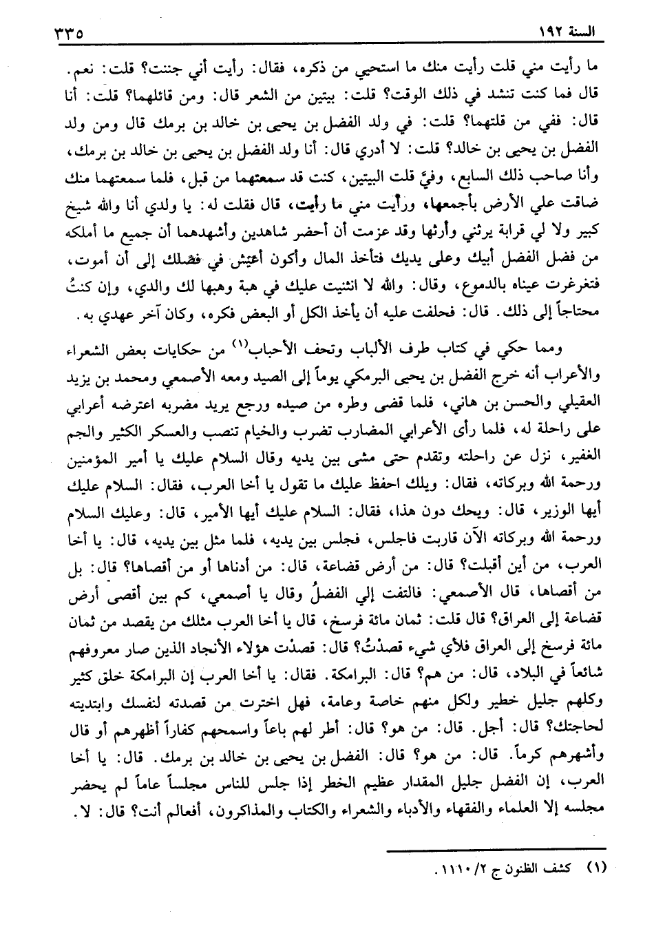 ما رأيت مني قلت رأيت منك ما استحيي من ذكره، فقال: رأيت أني جننت؟ قلت: نعم. قال فما كنت تنشد في ذلك الوقت؟ قلت: بيتين من الشعر قال: ومن قائلهما؟ قلت: أنا قال: ففي من قلتهما؟ قلت: في ولد الفضل بن يحيى بن خالد بن برمك قال ومن ولد الفضل بن يحيى بن خالد؟ قلت: لا أدري قال: انا ولد الفضل بن يحيى بن خالد بن برمك، وأنا صاحب ذلك السابع، وفي قلت البيتين، كنت قد سمعتهما من قبل، فلما سمعتهما منك ضاقت علي الأرض بأجمعها، ورأيت مني ما رأيت، قال فقلت له: يا ولدي أنا والله شيخ كبير ولا لي قرابة يرثني وأرثها وقد عزمت أن أحضر شاهدين وأشهدهما أن جميع ما أملكه من فضل الفضل أبيك وعلى يديك فتأخذ المال وكون أعيش في فضلك إلى أن أموت، فتغرغرت عيناه بالدموع، وقال: والله لا انثنيت عليك في هبة وهبها لك والدي، وإن كنت محتاجاً إلى ذلك. قال: فحلفت عليه أن يأخذ الكل أو البعض فكره، وكان آخر عهدي به. ومما حكي في كتاب طرف الألباب وتحف الأحباب من حكايات بعض الشعراء والأعراب أنه خرج الفضل بن يحيى البرمكي يوماً إلى الصيد ومعه الأصمعي ومحمد بن يزيد العقيلي والحسن بن هاني، فلما قضى وطره من صيده ورجع يريد مضربه اعترضه أعرابي على راحلة له، فلما رأى الأعرابي المضارب تضرب والخيام تنصب والعسكر الكثير والجم الغفير، نزل عن راحلته وتقدم حتى مشى بين يديه وقال السلام عليك يا أمير المؤمنين ورحمة الله وبركاته، فقال: ويلك احفظ عليك ما تقول يا أخا العرب، فقال: السلام عليك أيها الوزير، قال: ويحك دون هذا، فقال: السلام عليك أيها الأمير، قال: وعليك السلام ورحمة الله وبركاته الآن قاربت فاجلس، فجلس بين يديه، فلما مثل بين يديه، قال: يا أخا العرب، من أين أقبلت؟ قال: من أرض قضاعة، قال: من أدناها أو من أقصاها؟ قال: بل من أقصاها، قال الأصمعي: فالتفت إلي الفضل وقال يا أصمعي، كم بين أقصى أرض قضاعة إلى العراق؟ قال قلت: ثمان مائة فرسخ، قال يا أخا العرب مثلك من يقصد من ثمان مائة فرسخ إلى العراق فلأي شيء قصدت؟ قال: قصدت هؤلاء الأنجاد الذين صار معروفهم شائعاً في البلاد، قال: من هم؟ قال: البرامكة. فقال: يا أخا العرب إن البرامكة خلق كثير وكلهم جليل خطير ولكل منهم خاصة وعامة، فهل اخترت من قصدته لنفسك وابتديته لحاجتك؟ قال: اجل. قال: من هو؟ قال: اطر لهم باعاً واسمحهم كفاراً أظهرهم أو قال وأشهرهم كرماً. قال: من هو؟ قال: الفضل بن يحيى بن خالد بن برمك. قال: يا أخا العرب، ان الفضل جليل المقدار عظيم الخطر إذا جلس للناس مجلساً عاماً لم يحضر مجلسه إلا العلماء والفقهاء والأدباء والشعراء والكتاب والمذاكرون، افعالم أنت؟ قال: لا.