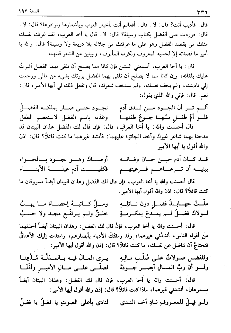قال: فأديب أنت؟ قال: لا. قال: افعالم أنت بأخبار العرب وبأشعارها ونوادرها؟ قال: لا. قال: فوردت على الفضل بكتاب وسيلة؟ قال: لا. قال يا أخا العرب، لقد غرتك نفسك مثلك من يقصد الفضل وهو على ما عرفتك من جلاله بلا ذريعة ولا وسيلة؟ قال: والله يا أمير ما قصدته إلا لحسبه المعروف ولكرمه المألوف، وببيتين من الشعر قلتهما. قال: يا أخا العرب، اسمعني البيتين فإن كانا مما يصلح أن تلقى بهما الفضل أشرت عليك بلقائه، وإن كانا مما لا يصلح أن تلقى بهما الفضل بررتك بشيء من مالي ورجعت إلي ناديتك، ولم يخف نفسك، ولم يستخف شعرك، قال وتفعل ذلك لي أيها الأمير، قال: نعم. قال: فإني والله الذي يقول: