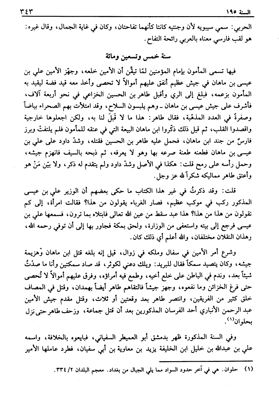 فيها تسمى المأمون بإمام المؤمنين لما تيقن أن الأمين خلعه، وجهز الأمين علي بن عيسى بن ماهان في جيش عظيم أنفق عليهم أموالاً لا تحصى وأخذ معه قيد فضة ليقيد به المأمون بزعمه، فبلغ إلى الري وأقبل طاهر بن الحسين الخزاعي في نحو أربعة آلاف، فأشرف على جيش عيسى بن ماهان - وهم يلبسون السلاح، وقد امتلأت بهم الصحراء بياضاً وصفرة في العدد المذهبة، فقال طاهر: هذا ما لا قبل لنا به، ولكن اجعلوها خارجية واقصدوا القلب، ثم قيل ذلك ذكروا ابن ماهان البيعة التي في عنقه للمأمون فلم يلتفت وبرز فارس من جند ابن ماهان، فحمل عليه طاهر بن الحسين فقتله، وشد داود على علي بن عيسى بن ماهان فطعنه طعنة صرعه بها وهو لا يعرفه، ثم ذبحه بالسيف فانهزم جيشه، وحمل رأسه على رمح قلت: هكذا في الأصل رشد داود ولم يتقدم له ذكر، ولا بين من هو وأعتق طاهر مماليكه شكراً لله عز وجل. قلت: وقد ذكرت في غير هذا الكتاب ما حكى بعضهم أن الوزير علي بن عيسى المذكور ركب في موكب عظيم، فصار الغرباء يقولون من هذا؟ فقالت امرأة، الى كم تقولون من هذا من هذا؟ هذا عبد سقط من عين الله تعالى فابتلاه بما ترون، فسمعها علي بن عيسى فرجع إلى بيته واستعفى من الوزارة، ولحق بمكة فجاور بها إلى أن توفي رحمه الله، وهذان النقلان مختلفان، والله أعلم أي ذلك كان. وشرع أمر الأمين في سفال وملكه في زوال، قيل إنه بلغه قتل ابن ماهان وهزيمة جيشه، وكان يتصيد سمكاً فقال للبريد: ويلك دعني لكوثر، قد صاد سمكتين وأنا ما صدت شيئاً بعد، وندم في الباطن على خلع أخيه، وطمع فيه أمراؤه، وفرق عليهم أموالاً لا تحصى حتى فرغ الخزائن وما نفعوه، وجهز جيشاً فالتقاهم طاهر أيضاً بهمدان، وقتل في المصاف خلق كثير من الفريقين، وانتصر طاهر بعد وقعتين أو ثلاث، وقتل مقدم جيش الأمين عبد الرحمن الأنباري أحد الفرسان المذكورين بعد أن قتل جماعة، وزحف طاهر حتى نزل بحلوان. وفي السنة المذكورة ظهر بدمشق أبو العميطر السفياني، فبايعوه بالخلافة، واسمه علي بن عبد الله بن خليل ابن الخليفة يزيد بن معاوية بن أبي سفيان، فطرد عاملها الأمير