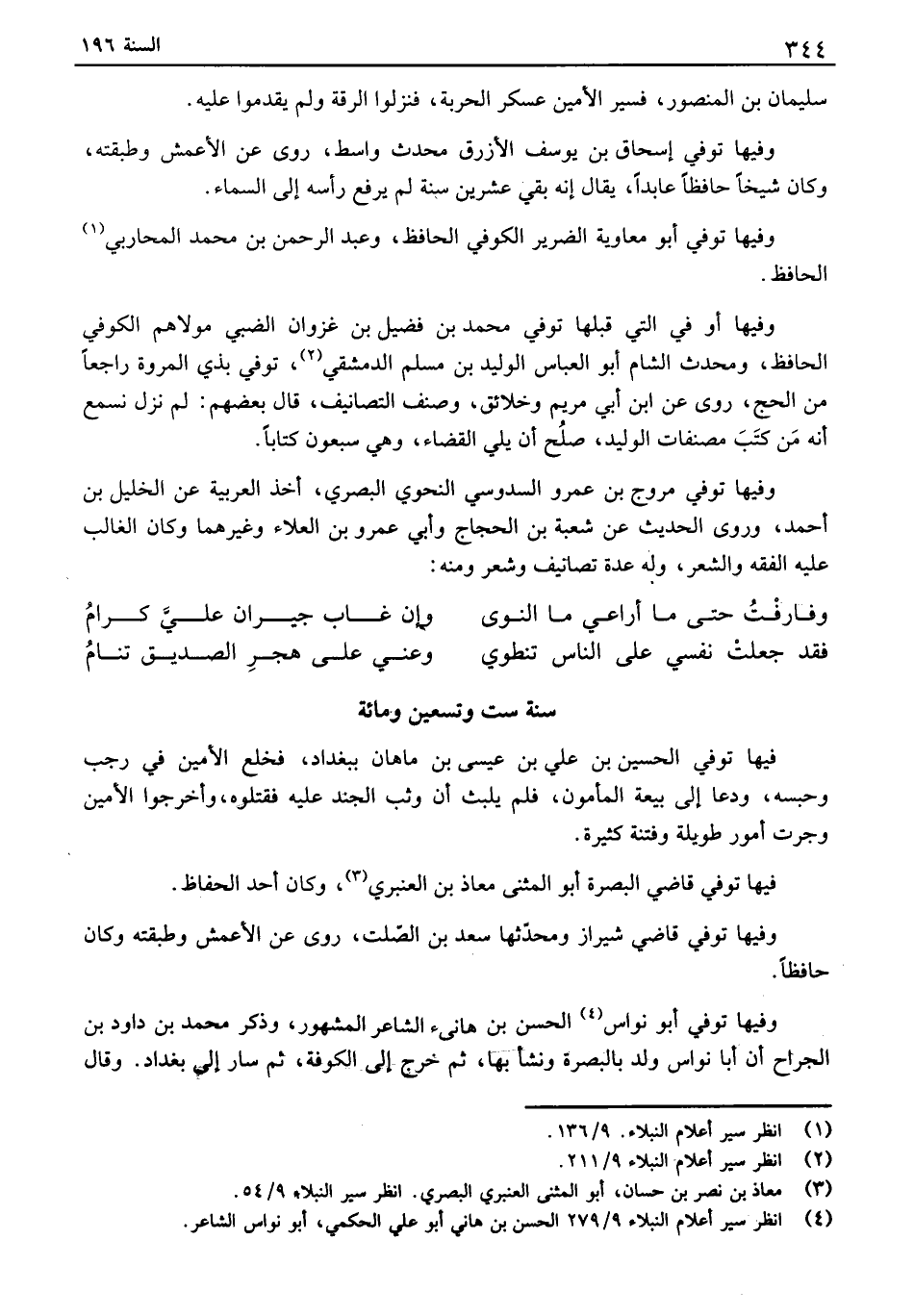 سليمان بن المنصور، فسير الأمين عسكر الحربة، فنزلوا الرقة ولم يقدموا عليه. وفيها توفي إسحاق بن يوسف الأزرق محدث واسط، روى عن الأعمش وطبقته، وكان شيخاً حافظاً عابداً، يقال إنه بقي عشرين سنة لم يرفع رأسه إلى السماء. وفيها توفي أبو معاوية الضرير الكوفي الحافظ، وعبد الرحمن بن محمد المحاربي الحافظ. وفيها أو في التي قبلها توفي محمد بن فضيل بن غزوان الضبي مولاهم الكوفي الحافظ، ومحدث الشام أبو العباس الوليد بن مسلم الدمشقي، توفي بذي المروة راجعاً من الحج، روى عن ابن أبي مريم وخلائق، وصنف التصانيف، قال بعضهم: لم نزل نسمع أنه من كتب مصنفات الوليد، صلح أن يلي القضاء، وهي سبعون كتاباً. وفيها توفي مروج بن عمرو السدوسي النحوي البصري، اخذ العربية عن الخليل بن أحمد، وروى الحديث عن شعبة بن الحجاج وأبي عمرو بن العلاء وغيرهما وكان الغالب عليه الفقه والشعر، وله عدة تصانيف وشعر ومنه:
