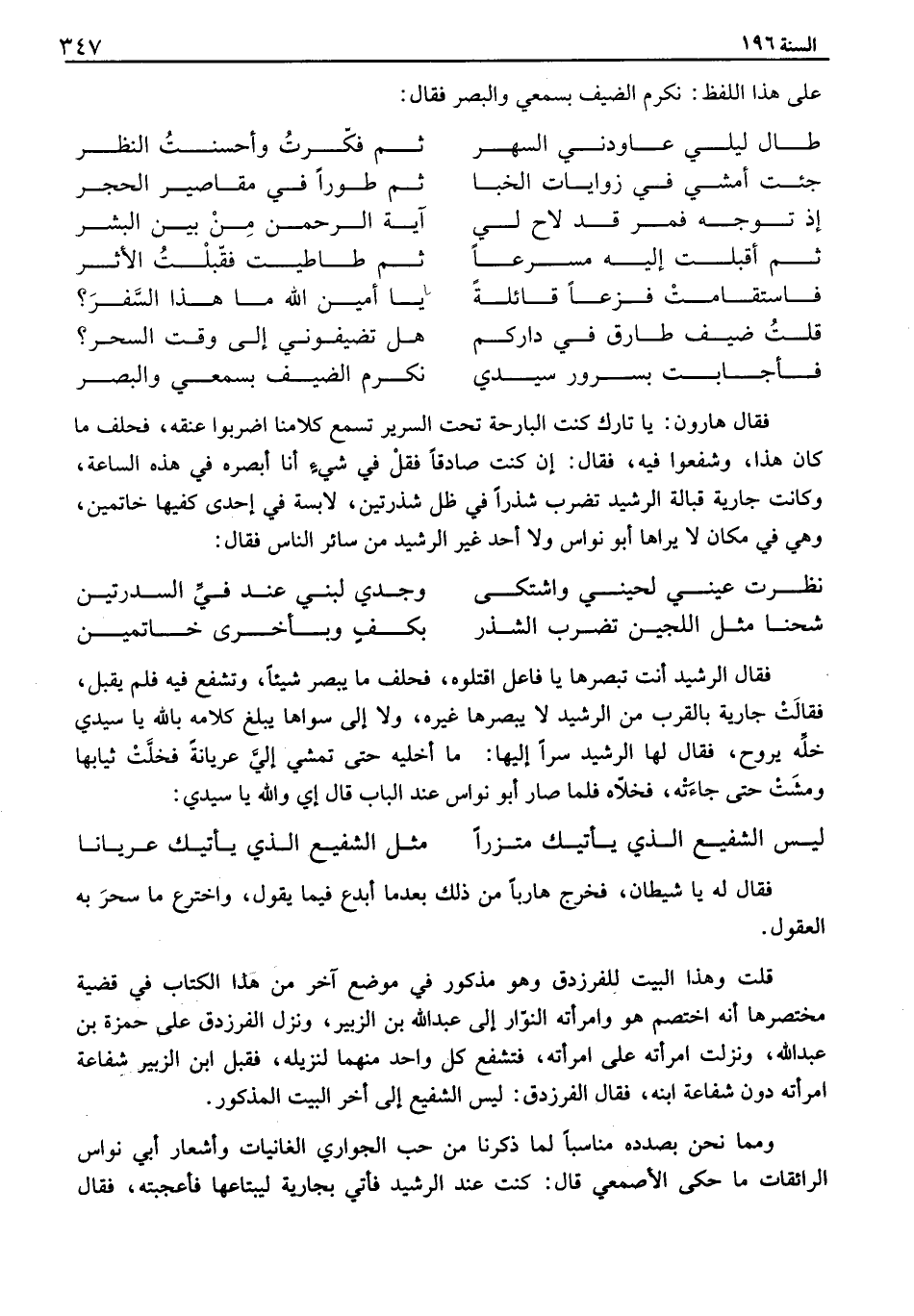 فقال له يا شيطان، فخرج هارباً من ذلك بعدما أبدع فيما يقول، واخترع ما سحر به العقول. قلت وهذا البيت للفرزدق وهو مذكور في موضع آخر من هذا الكتاب في قضية مختصرها أنه اختصم هو وامرأته النوار إلى عبد الله بن الزبير، ونزل الفرزدق على حمزة بن عبد الله، ونزلت امرأته على امرأته، فتشفع كل واحد منهما لنزيله، فقبل ابن الزبير شفاعة امرأته دون شفاعة ابنه، فقال الفرزدق: ليس الشفيع إلى أخر البيت المذكور. ومما نحن بصدده مناسباً لما ذكرنا من حب الجواري الغانيات وأشعار أبي نواس الرائقات ما حكى الأصمعي قال: كنت عند الرشيد فأتي بجارية ليبتاعها فأعجبته، فقال