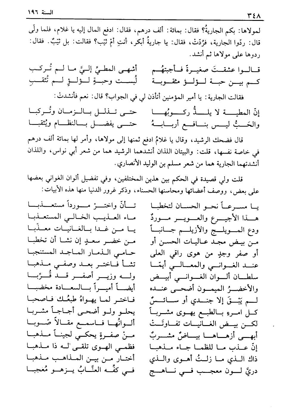 قال فضحك الرشيد، وقال يا غلام ادفع ثمنها إلى مولاها، وأمر لها بمائة ألف درهم في خاصة نفسها، قلت: والبيتان اللذان أنشدهما الرشيد هما من شعر أبي نواس، واللذان أنشدتهما الجارية هما من شعر مسلم بن الوليد الأنصاري. قلت ولي قصيدة في الحكم بين هذين المختلفين، وفي تفضيل ألوان الغواني بعضها على بعض، ووصف أعضائها ومحاسنها الحسناء، وذكر غرور الدنيا منها هذه الأبيات: