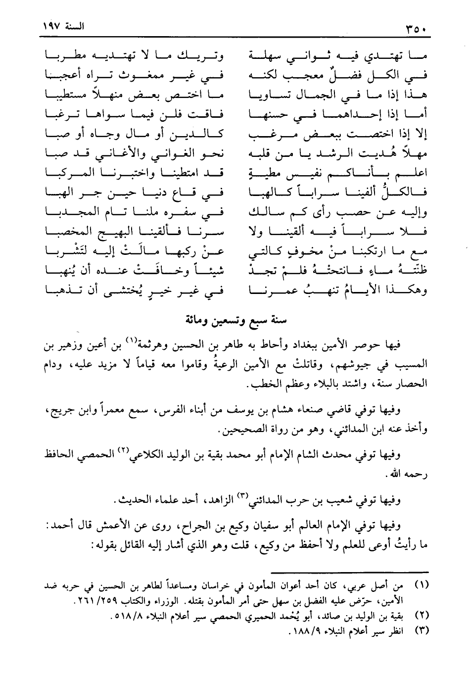 وفيها توفي محدث الشام الإمام أبو محمد بقية بن الوليد الكلاعي الحمصي الحافظ رحمه الله. وفيها توفي شعيب بن حرب المدائني الزاهد، احد علماء الحديث. وفيها توفي الإمام العالم أبو سفيان وكيع بن الجراح، روى عن الأعمش قال أحمد: ما رأيت أوعى للعلم ولا أحفظ من وكيع، قلت وهو الذي أشار إليه القائل بقوله: