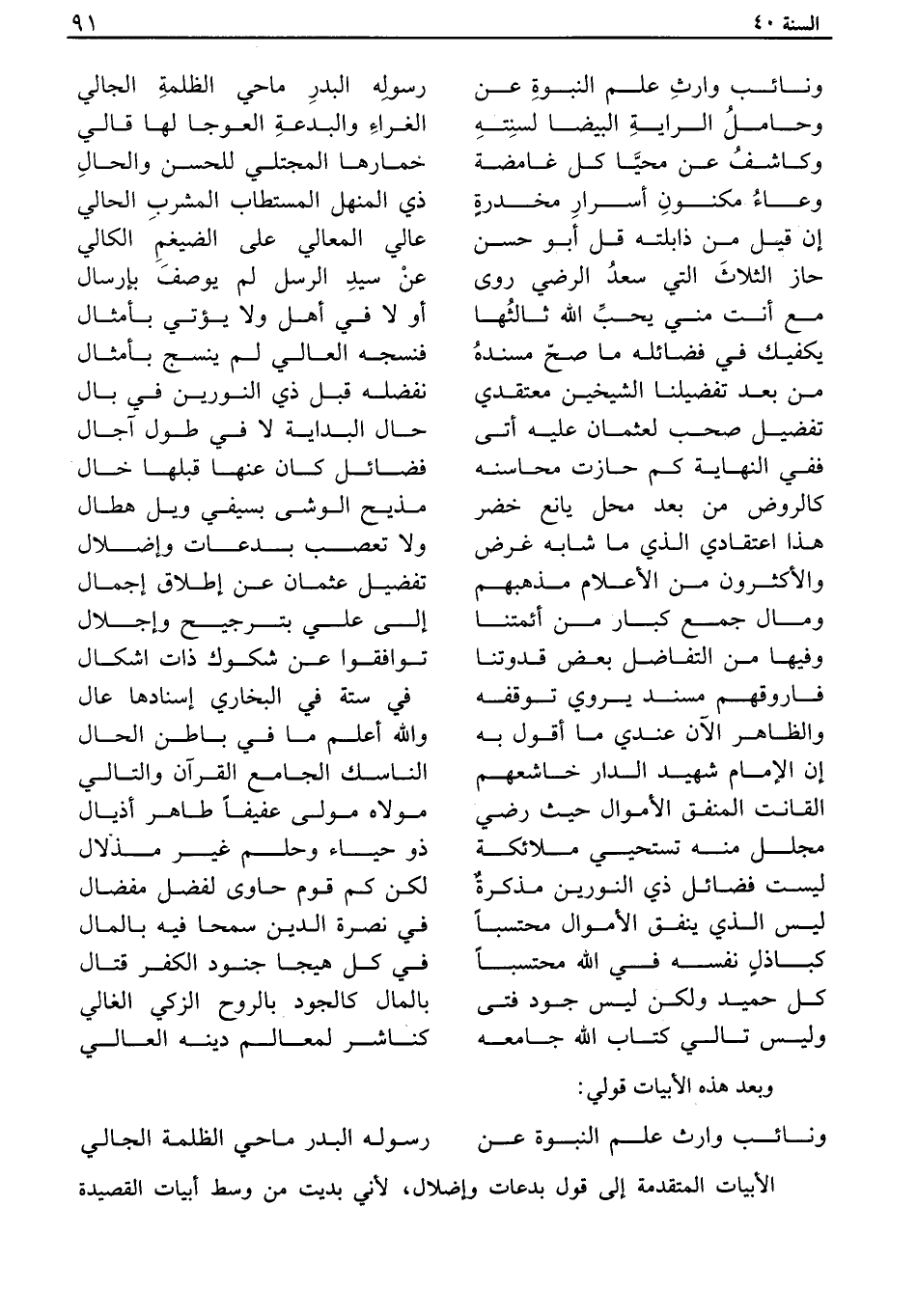 ونائب وارث علم النبوة عن ... رسوله البدر ماحي الظلمة الجالي