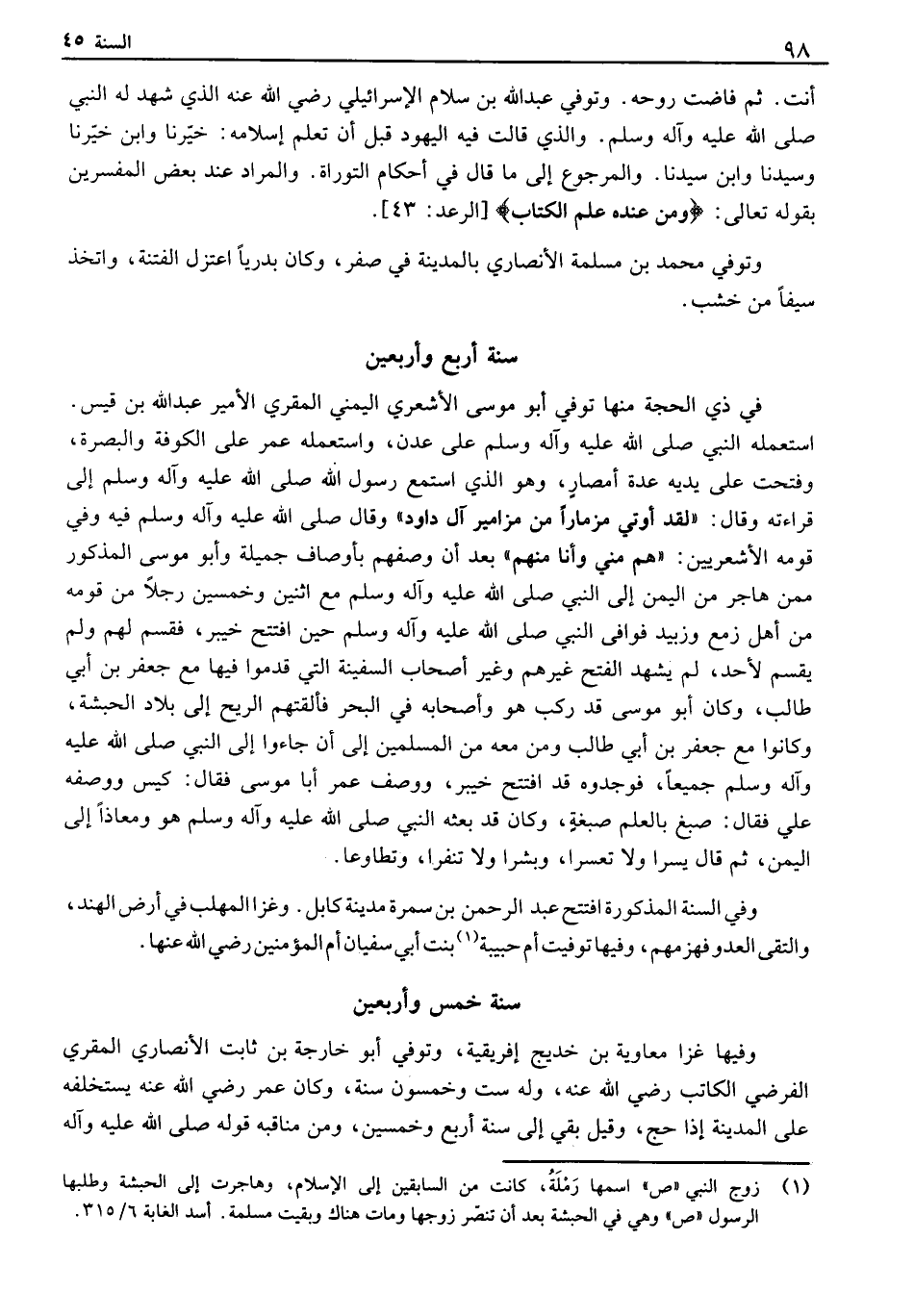 أنت. ثم فاضت روحه. وتوفي عبد الله بن سلام الإسراتيلي رضي الله عنه الذي شهد له النبي صلى الله عليه وآله وسلم. والذي قالت فيه اليهود قبل أن تعلم إسلامه: خيرنا وابن خيرنا وسيدنا وابن سيدنا. والمرجوع إلى ما قال في أحكام التوراة. والمراد عند بعض المفسرين بقوله تعالى: " ومن عنده علم الكتاب " - الرعد: 43 -. وتوفي محمد بن مسلمة الأنصاري بالمدينة في صفر، وكان بدرياً اعتزل الفتنة، واتخذ سيفاً من خشب.