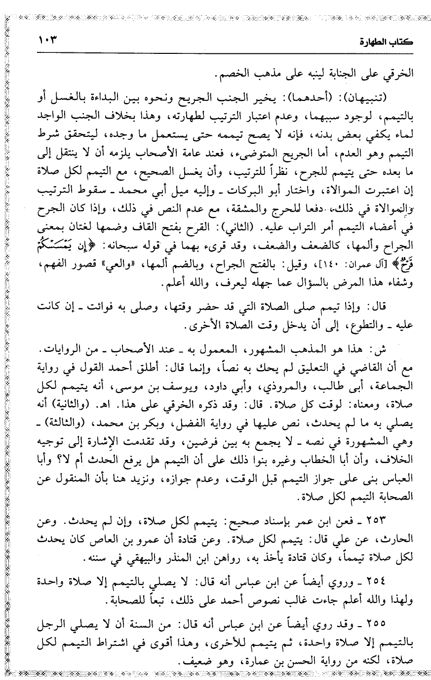 254 وروي أيضاً عن ابن عباس أنه قال : لا يصلي بالتيمم إلا صلاة واحدة ولهذا والله أعلم جاءت غالب نصوص أحمد على ذلك ، تبعاً للصحابة .