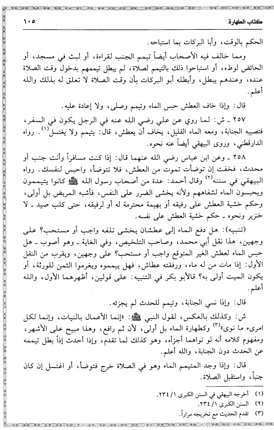 258 وعن ابن عباس رضي الله عنهما قال : إذا كنت مسافراً وأنت جنب أو محدث ، فخفت إن توضأت تموت من العطش ، فلا تتوضأ ، واحبس لنفسك . رواه البيهقي في سننه وقال أحمد : عدة من أصحاب رسول الله كانوا يتيممون ويحبسون الماء لشفاههم ولأنه يخشى الضرر على النفس ، فأشبه المريض بل أولى ، وحكم خشية العطش على رفيقه أو بهيمة محترمة له أو لرفيقه ، حتى كلب صيد لا خنزير ونحوه حكم خشية العطش على نفسه .