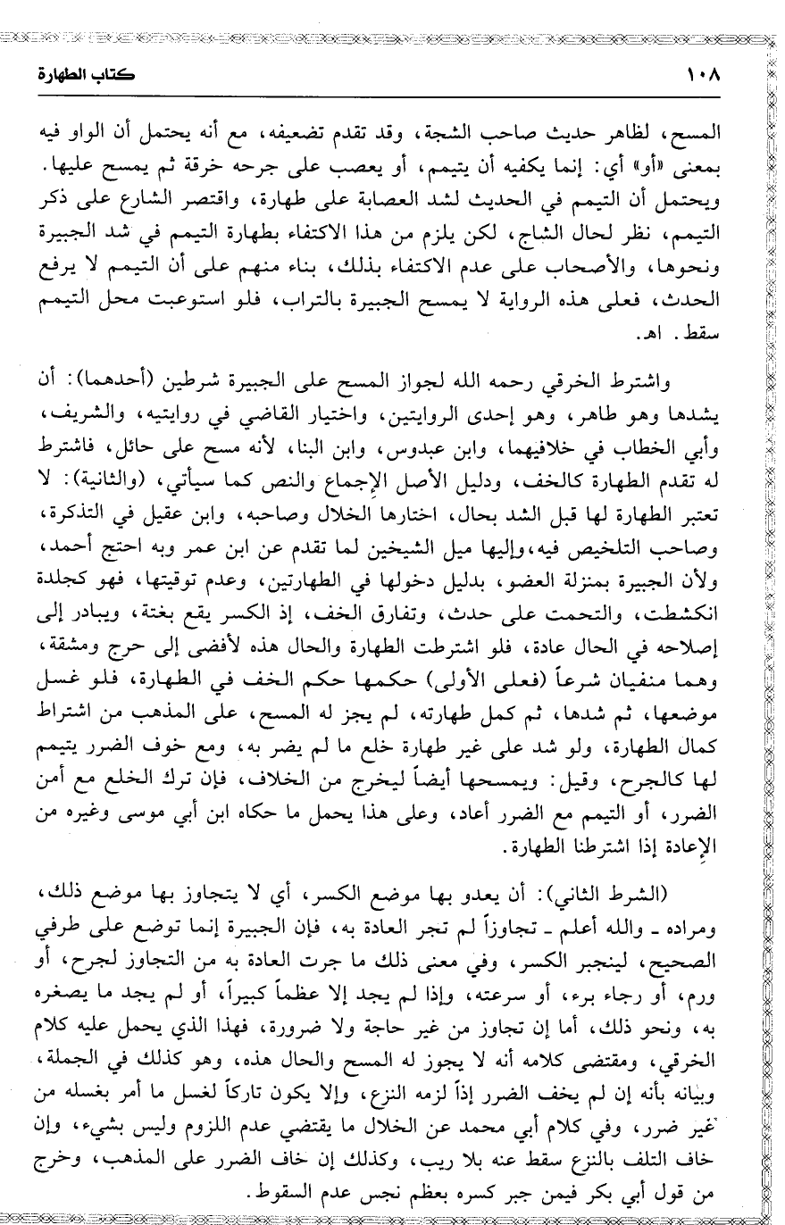 واشترط الخرقي رحمه الله لجواز المسح على الجبيرة شرطين ( أحدهما ) : أن يشدها وهو طاهر ، وهو إحدى الروايتين ، واختيار القاضي في روايتيه ، والشريف ، وأبي الخطاب في خلافيهما ، ) 19 ( وابن عبدوس ، وابن البنا ، لأنه مسح على حائل ، فاشترط له تقدم الطهارة كالخف ، ودليل الأصل الإِجماع والنص كما سيأتي ، ( والثانية ) : لا تعتبر الطهارة لها قبل الشد بحال ، اختارها الخلال وصاحبه ، وابن عقيل في التذكرة ، وصاحب التلخيص فيه ، وإليها ميل الشيخين لما تقدم عن ابن عمر وبه احتج أحمد ، ولأن الجبيرة بمنزلة العضو ، بدليل دخولها في الطهارتين ، وعدم توقيتها ، فهو كجلدة انكشطت ، والتحمت على حدث ، وتفارق الخف ، إذ الكسر يقع بغتة ، ويبادر إلى إصلاحه في الحال عادة ، فلو اشترطت الطهارة والحال هذه لأفضى إلى حرج ومشقة ، وهما منفيان شرعاً ( فعلى الأولى ) حكمها حكم الخف في الطهارة ، فلو غسل موضعها ، ثم شدها ، ثم كمل طهارته ، لم يجز له المسح ، على المذهب من اشتراط كمال الطهارة ، ولو شد على غير طهارة خلع ما لم يضر به ، ومع خوف الضرر يتيمم لها كالجرح ، وقيل : ويمسحها أيضاً ليخرج من الخلاف ، فإن ترك الخلع مع أمن الضرر ، أو التيمم مع الضرر أعاد ، وعلى هذا يحمل ما حكاه ابن أبي موسى وغيره من الإِعادة إذا اشترطنا الطهارة .