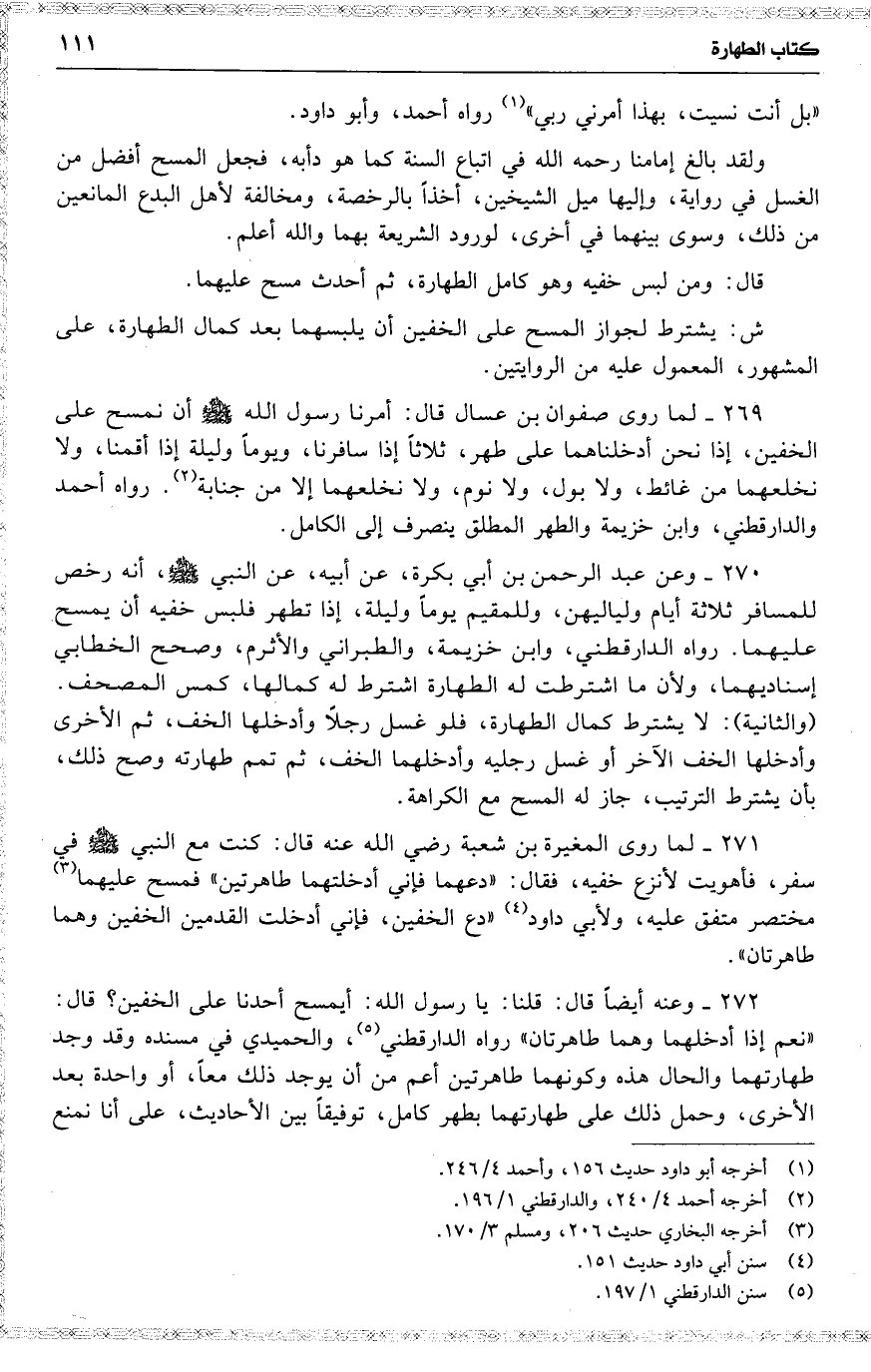 269 لما روى صفوان بن عسال قال : أمرنا رسول الله أن نمسح على الخفين ، إذا نحن أدخلناهما على طهر ، ثلاثاً إذا سافرنا ، ويوماً وليلة إذا أقمنا ، ولا نخلعهما من غائط ، ولا بول ، ولا نوم ، ولا نخلعهما إلا من جنابة . رواه أحمد والدارقطني ، وابن خزيمة والطهر المطلق ينصرف إلى الكامل .