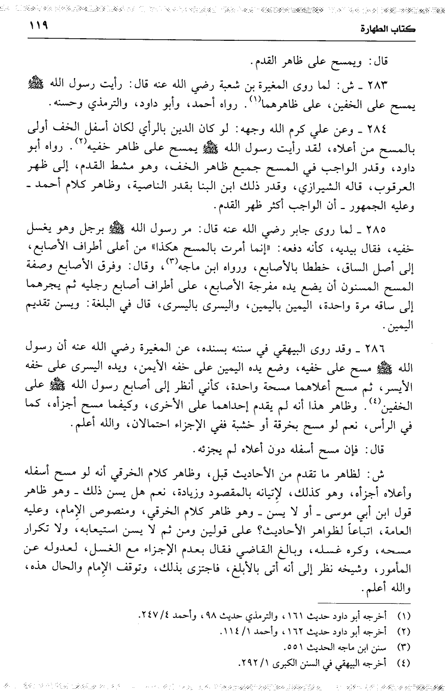 283 ش : لما روى المغيرة بن شعبة رضي الله عنه قال : رأيت رسول الله يمسح على الخفين ، على ظاهرهما . رواه أحمد ، وأبو داود ، والترمذي وحسنه .