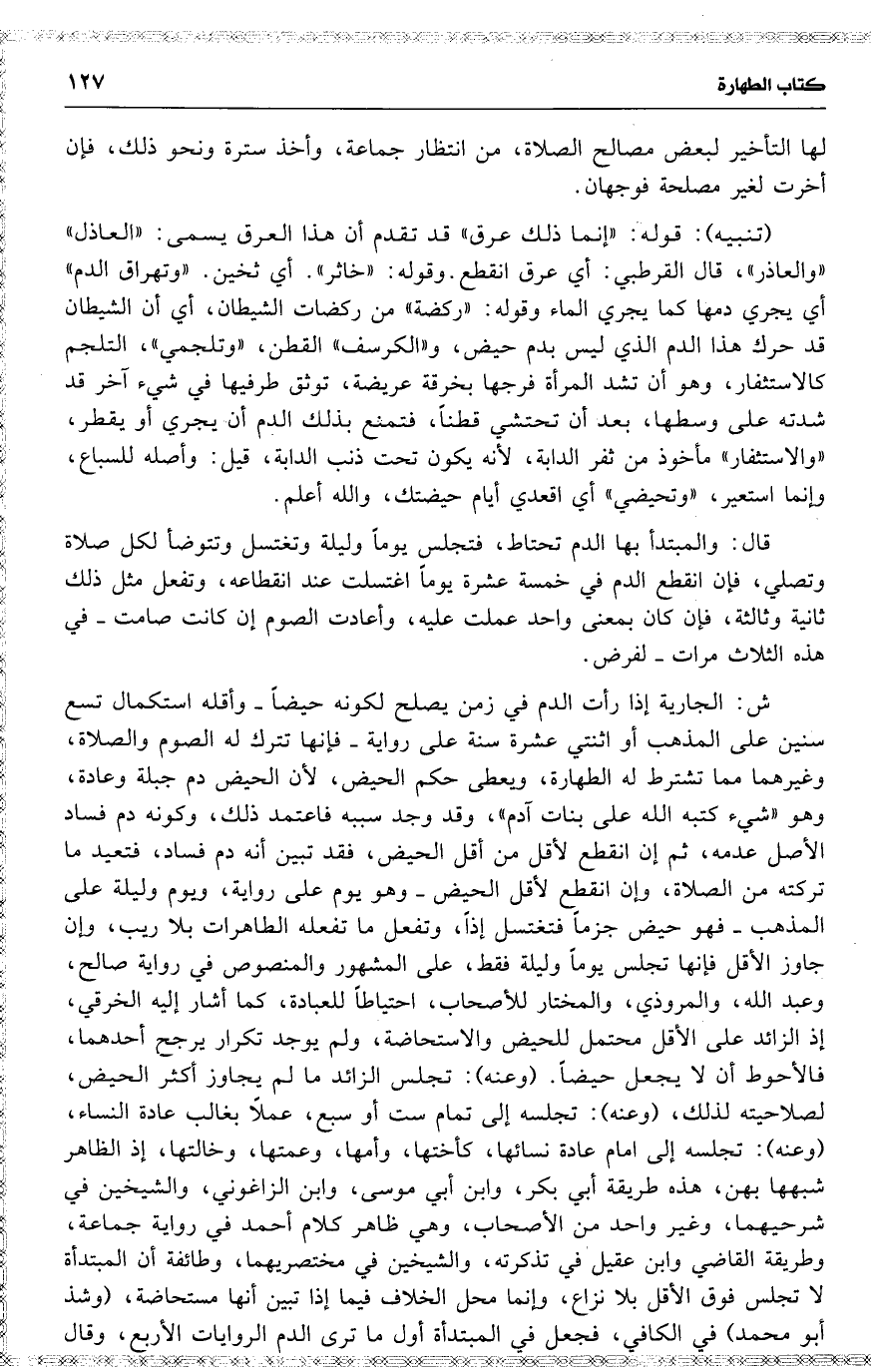 ( تنبيه ) : قوله : ( إنما ذلك عرق ) قد تقدم أن هذا العرق يسمى : ( العاذل ) ( والعاذر ) ، قال القرطبي : أي عرق انقطع . وقوله : ( خاثر ) . أي ثخين . ( وتهراق الدم ) أي يجري دمها كما يجري الماء وقوله : ( ركضة ) من ركضات الشيطان ، أي أن الشيطان قد حرك هذا الدم الذي ليس بدم حيض ، و ( الكرسف ) القطن ، ( وتلجمي ) ، التلجم كالاستثفار ، وهو أن تشد المرأة فرجها بخرقة عريضة ، توثق طرفيها في شيء آخر قد شدته على وسطها ، بعد أن تحتشي قطناً ، فتمنع بذلك الدم أن يجري أن يقطر ، ( والاستثفار ] مأخوذ من ثفر الدابة ، لأنه يكون تحت ذنب الدابة ، قيل : وأصله للسباع ، وإنما استعير ، ( وتحيضي ) أي اقعدي أيام حيضتك ، والله أعلم .