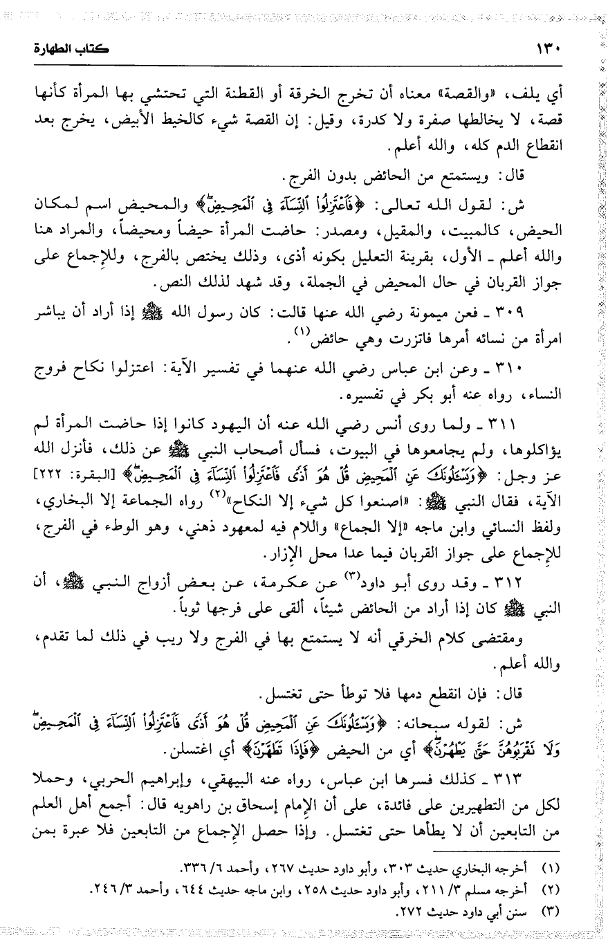 309 فعن ميمونة رضي الله عنها قالت : كان رسول الله إذا أراد أن يباشر امرأة من نسائه أمرها فاتزرت وهي حائض .