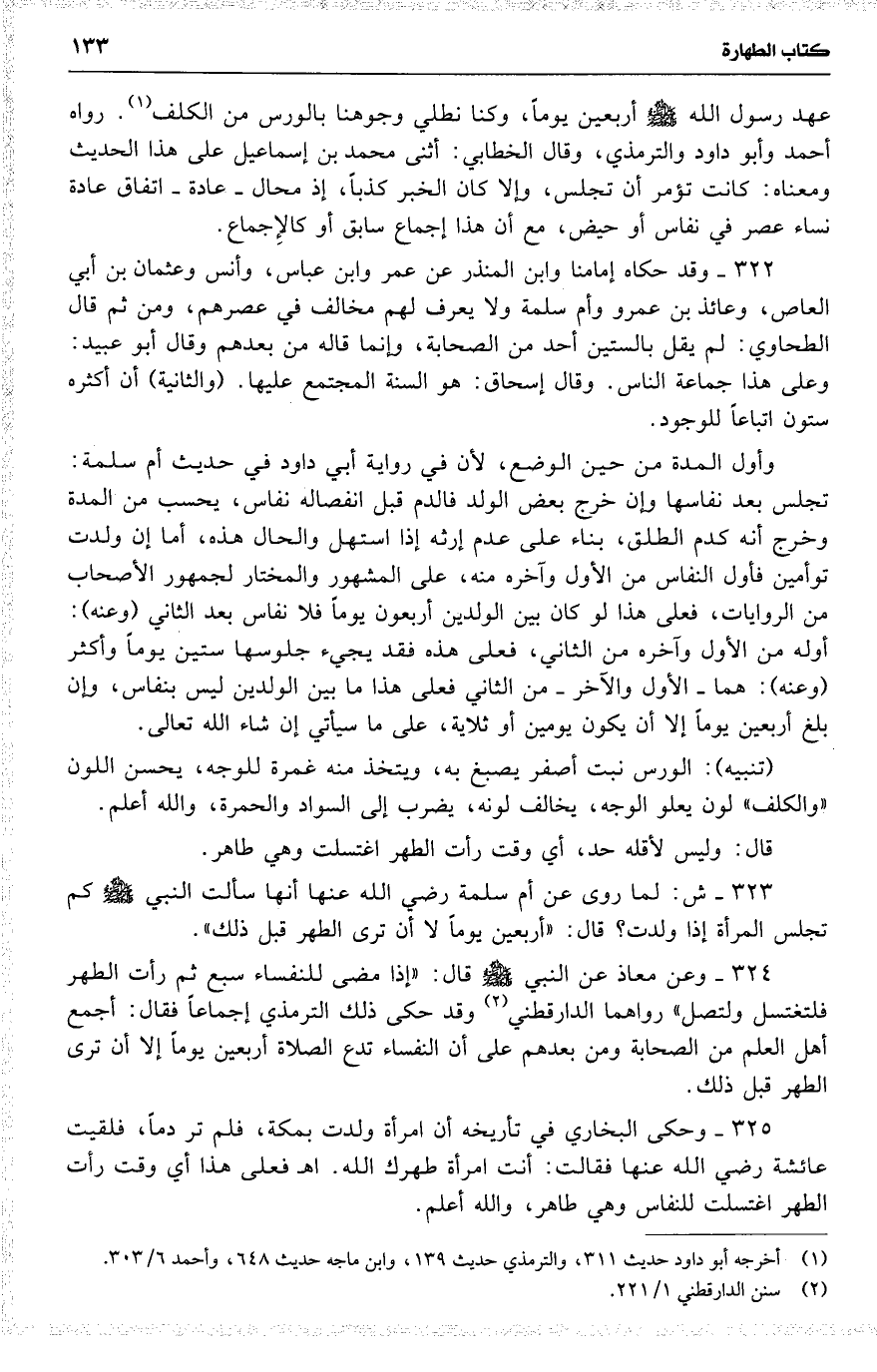 323 ش : لما روى عن أم سلمة رضي الله عنها أنها سألت النبي كم تجلس المرأة إذا ولدت ؟ قال : ( أربعين يوماً لا أن ترى الطهر قبل ذلك ) .