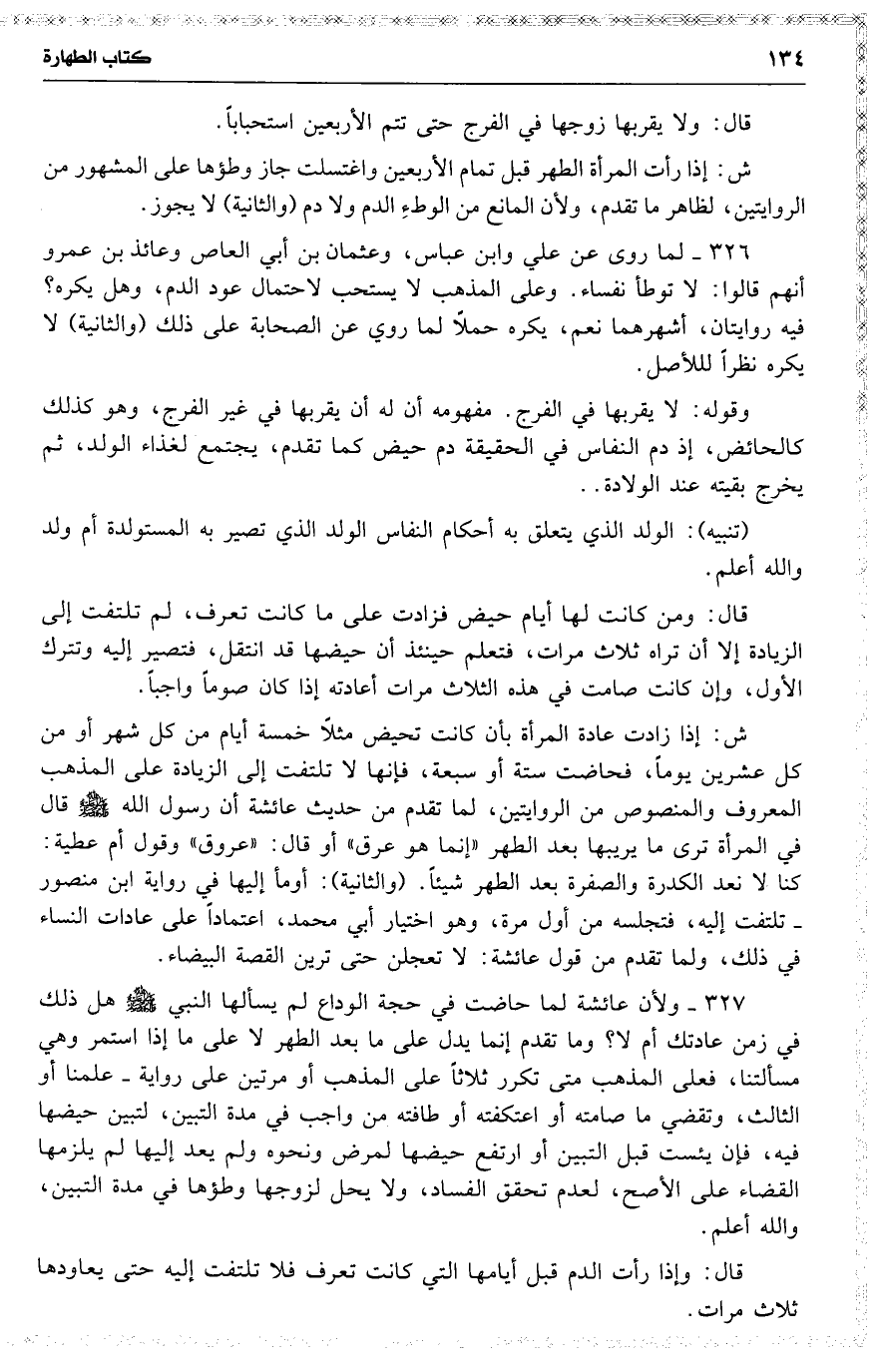 326 لما روى عن علي وابن عباس ، وعثمان بن أبي العاص وعائذ ابن عمرو أنهم قالوا : لا توطأ نفساء . وعلى المذهب لا يستحب لاحتمال عود الدم ، وهل يكره ؟ فيه روايتان ، أشهرهما نعم ، يكره حملًا لما روي عن الصحابة على ذلك ( والثانية ) لا يكره نظراً لللأصل .