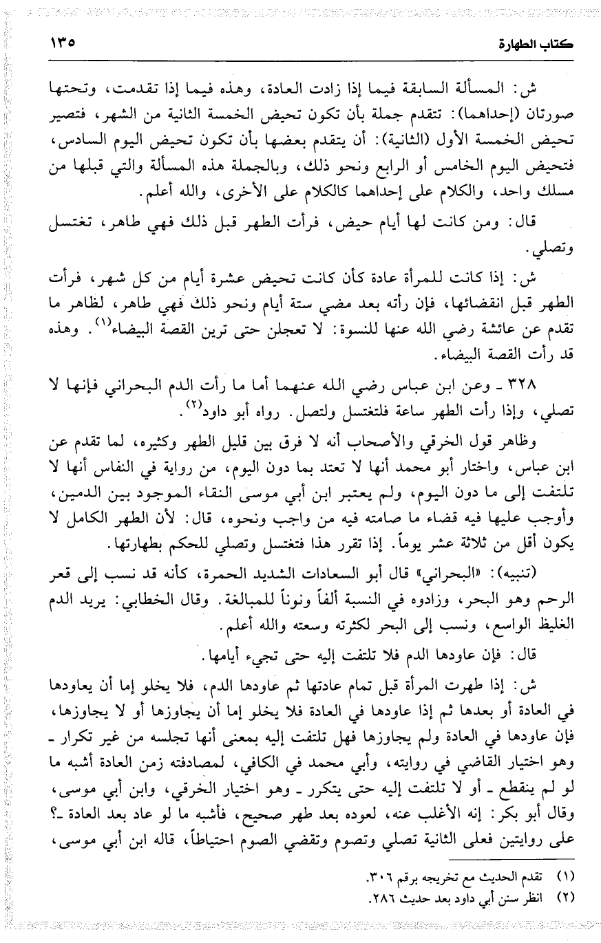ش : إذا طهرت المرأة قبل تمام عادتها ثم عاودها الدم ، فلا يخلو إما أن يعاودها في العادة أو بعدها ثم إذا عاودها في العادة فلا يخلو إما أن يجاوزها أو لا يجاوزها ، فإن عاودها في العادة ولم يجاوزها فهل تلتفت إليه بمعنى أنها تجلسه من غير تكرار وهو اختيار القاضي في روايته ، وأب محمد في الكافي ، لمصادفته زمن العادة أشبه ما لو لم ينقطع أو لا تلتفت إلهي حتى يتكرر وهو اختيار الخرقي ، وابن أبي موسى ، وقال أبو بكر : إنه الأغلب عنه ، لعوده بعد طهر صحيح ، فأشبه ما لو عاد بعد العادة ؟ على روايتين فعلى الثانية تصلي وتصوم وتقضي الصوم احتياطاً ، قاله ابن أبي موسى ،