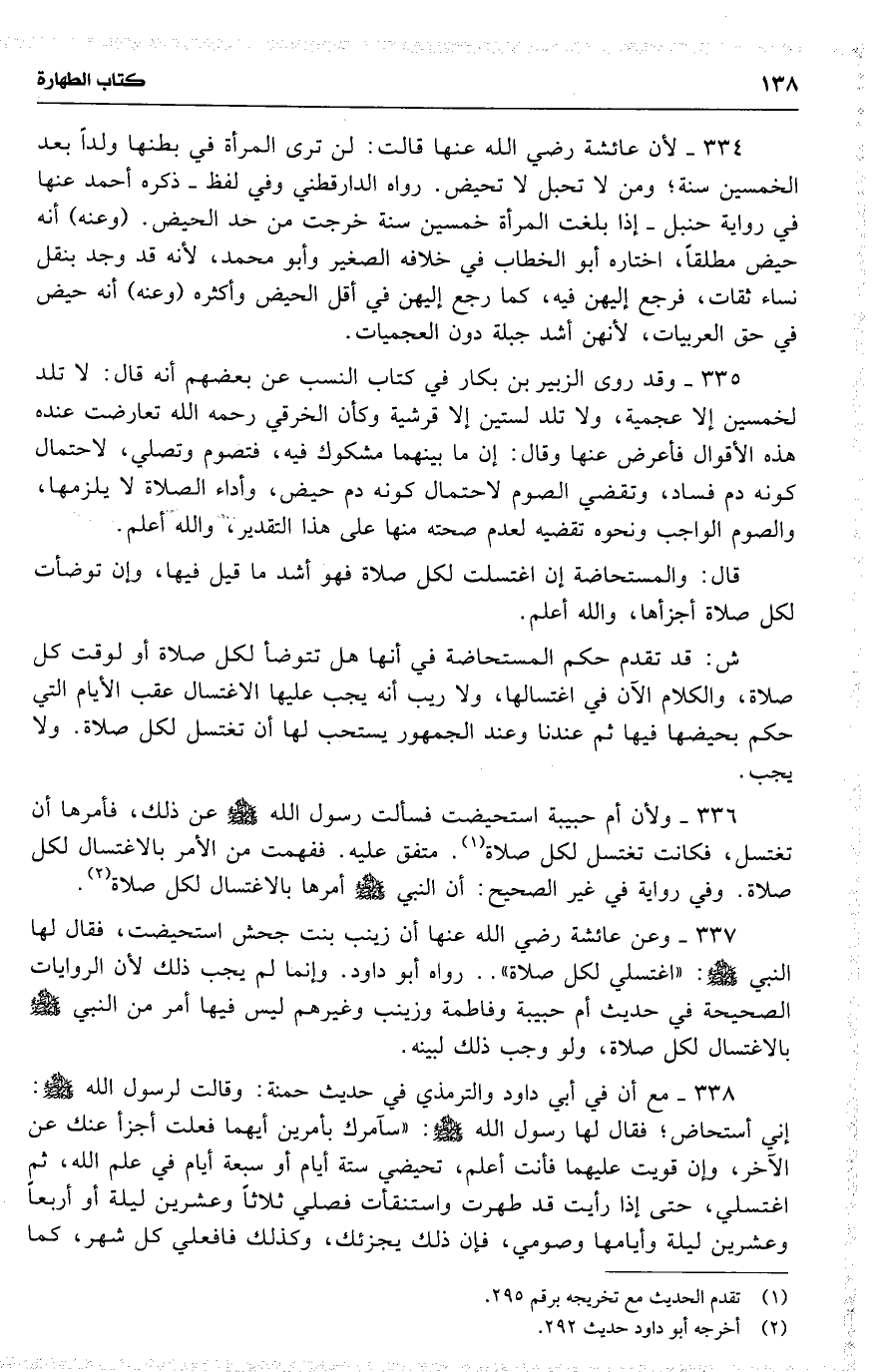 338 مع أن في أبي داود والترمذي في حديث حمنة : وقالت لرسول الله : إني أستحاض ؛ فقال لها رسول الله : ( سآمرك بأمرين أيهما فعلت أجزأ عنك عن الآخر ، وإن قويت عليهما فأنت أعلم ، تحيضي ستة أيام أو سبعة أيام في علم الله ، ثم اغتسلي ، حتى إذا رأيت قد طهرت واستنقأت فصلي ثلاثاً وعشرين ليلة أو أربعاً وعشرين ليلة وأيامها وصومي ، فإن ذلك يجزئك ، وكذلك فافعلي كل شهر ، كما