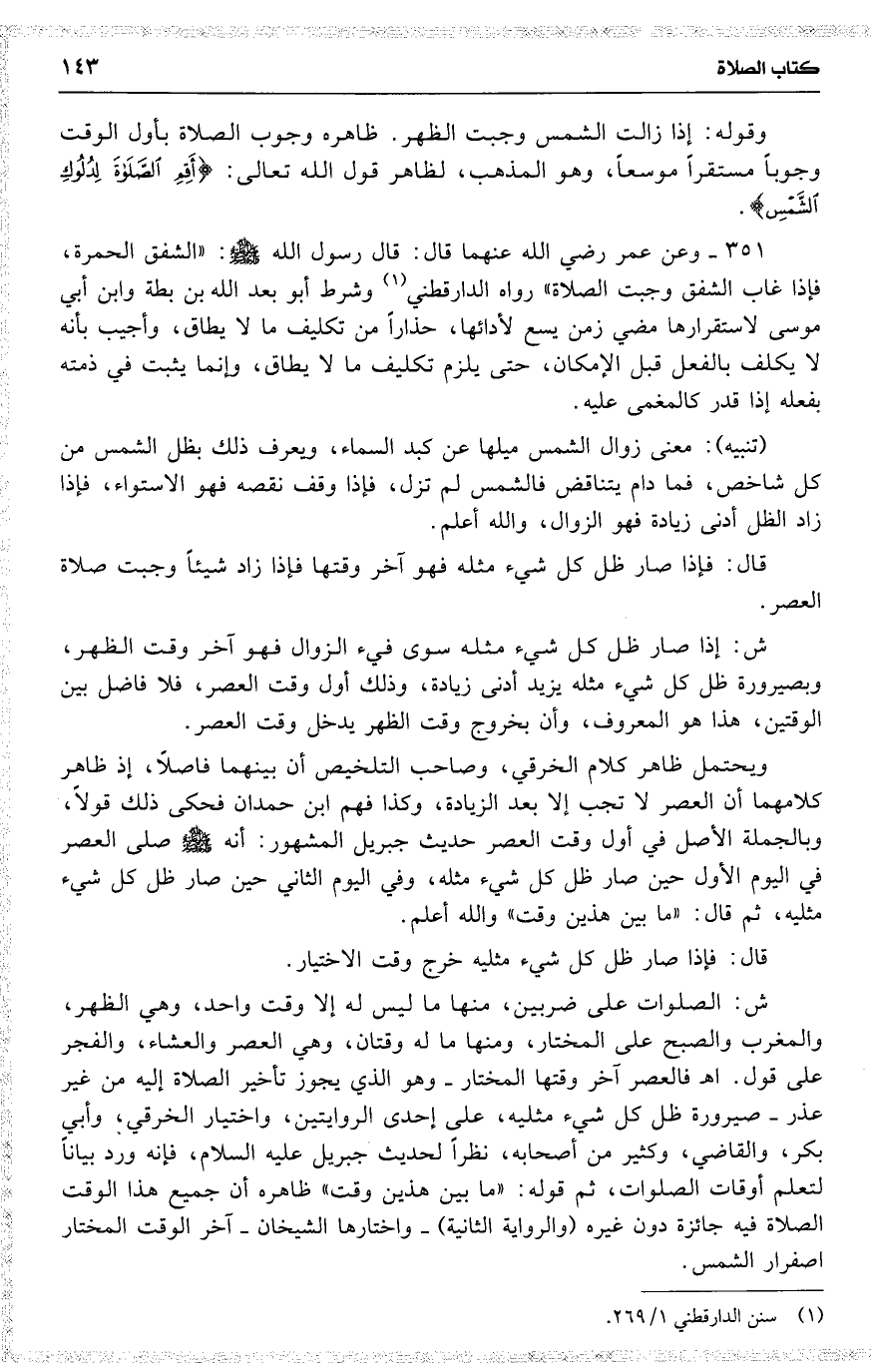 351 وعن ابن عمر رضي الله عنهما قال : قال رسول الله : ( الشفق الحمرة ، فإذا غاب الشفق وجبت الصلاة ) رواه الدارقطني وشرط أبو بعد الله بن بطة وابن أبي موسى لاستقرارها مضي زمن يسع لأدائها ، حذاراً من تكليف ما لا يطاق ، وأجيب بأنه لا يكلف بالفعل قبل الإمكان ، حتى يلزم [ تكليف ] ما لا يطاق ، وإنما يثبت في ذمته بفعله إذا قدر كالمغمى عليه .