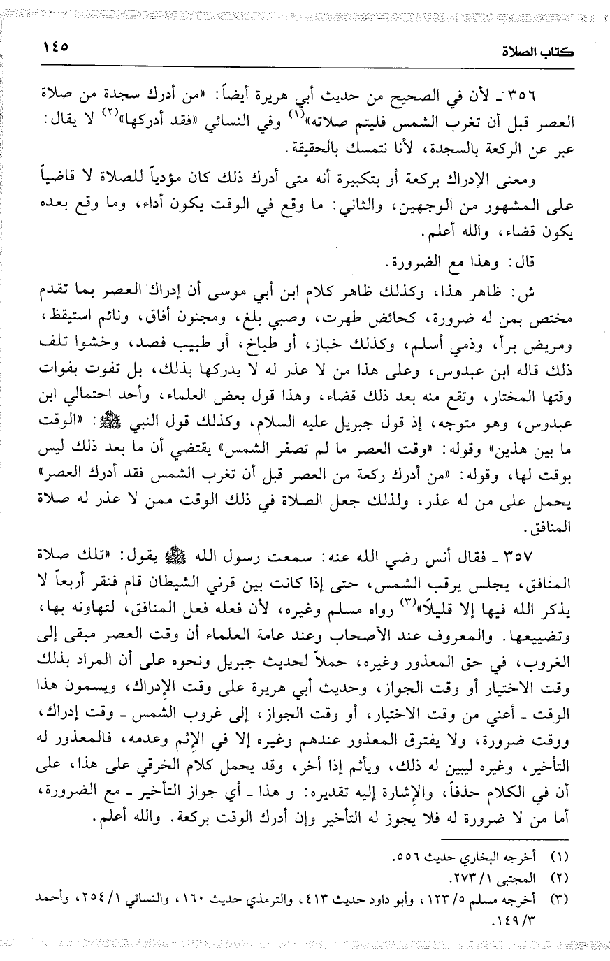 356 لأن في الصحيح من حديث أبي هريرة أيضاً : ( من أدرك سجدة من صلاة العصر قبل أن تغرب الشمس فليتم صلاته ) وفي النسائي ( فقد أدركها ) لا يقال : عبر عن الركعة بالسجدة ، لأنا نتمسك بالحقيقة .