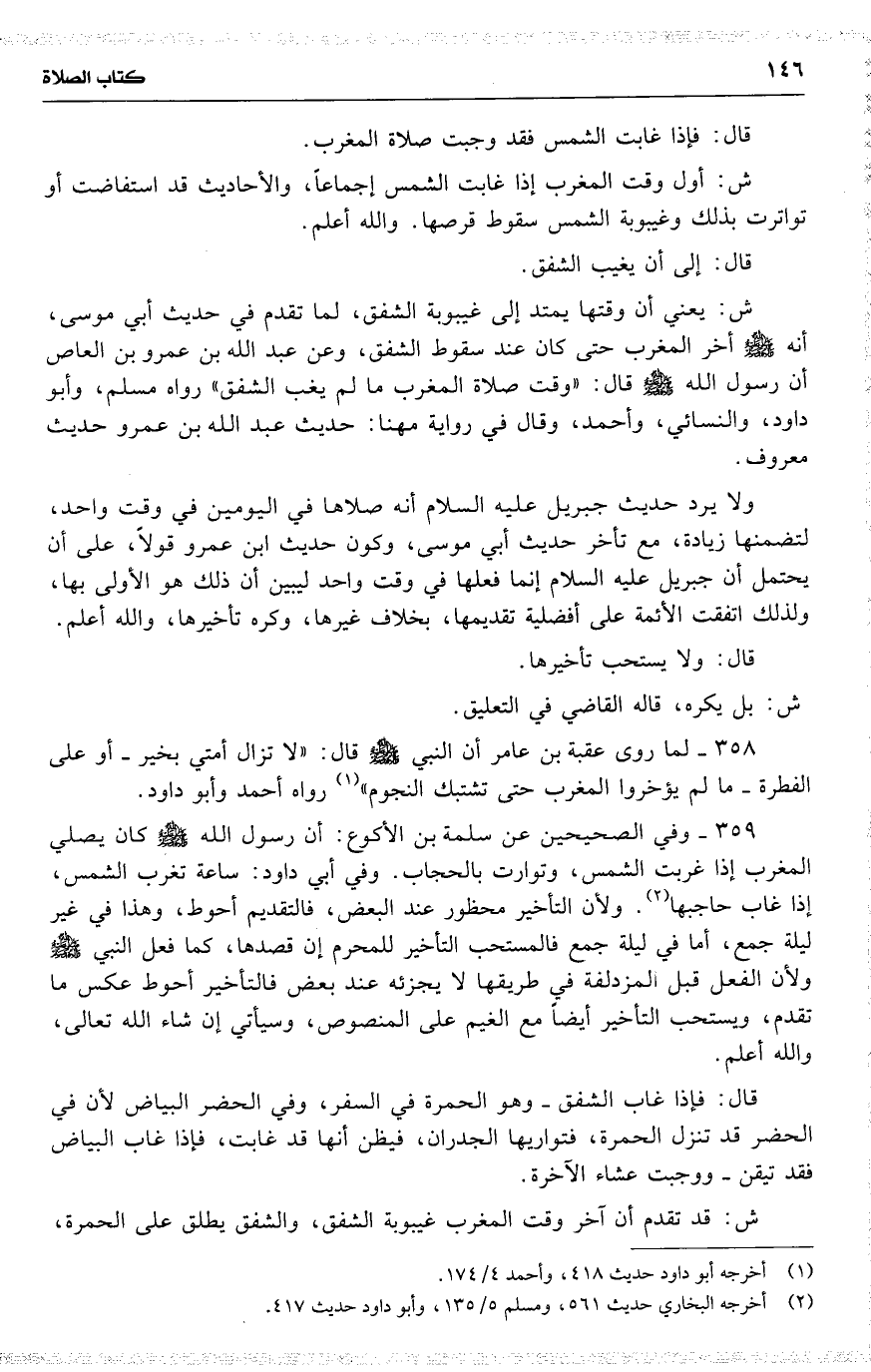ش : يعني أن وقتها يمتد إلى غيبوبة الشفق ، لما تقدم في حديث أبي موسى ، أنه أخر المغرب حتى كان عند سقوط الشفق ، وعن عبد الله بن عمرو بن العاص أن رسول الله قال : ( وقت صلاة المغرب ما لم يغب الشفق ) رواه مسلم ، وأبو داود ، والنسائي ، وأحمد ، وقال في رواية مهنا : حديث عبد الله بن عمرو حديث معروف .