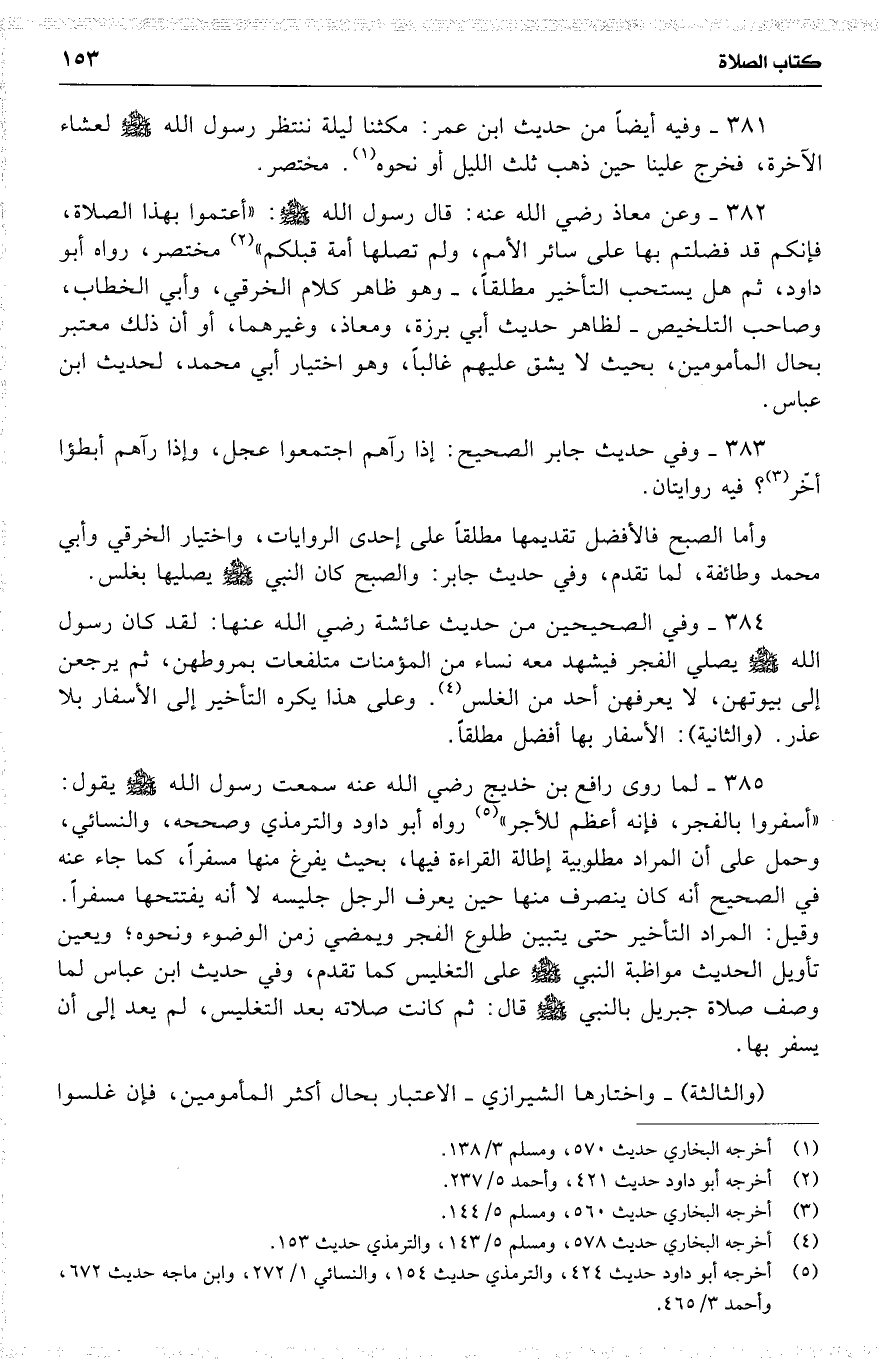 385 لما روى رافع بن خديج [ رضي الله عنه ] سمعت رسول الله [ ] يقول : ( أسفروا بالفجر ، فإنه أعظم للأجر ) رواه أبو داود والترمذي وصححه ، والنسائي ، وحمل على أن المراد مطلوبية إطالة القراءة [ فيها ] ، بحيث يفرغ منها مسفراً ، كما جاء عنه في الصحيح أنه كان ينصرف منها حين يعرف الرجل جليسه لا أنه يفتتحها مسفراً . وقيل : المراد التأخير حتى يتبين طلوع الفجر ويمضي زمن الوضوء ونحوه ؛ ويعين تأويل الحديث مواظبة النبي [ ] على التغليس كما تقدم ، وفي حديث ابن عباس لما وصف صلاة جبريل بالنبي قال : ثم كانت صلاته بعد التغليس ، لم يعد إلى أن يسفر بها .