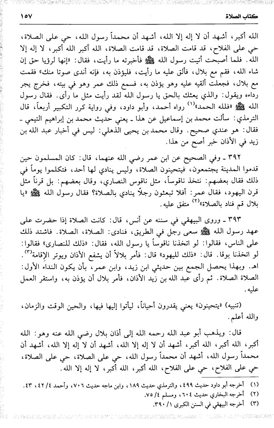 392 وفي الصحيح عن ابن عمر [ رضي الله عنهما ] ، قال : كان المسلمون حين قدموا المدينة يجتمعون ، فيتحينون الصلاة ، وليس ينادي لها أحد ، فتكلموا يوماً في ذلك فقال بعضهم : نتخذ ناقوساً ، مثل ناقوس النصاري ، وقال بعضهم : بل قرنا مثل قرن اليهود ، فقال عمر : أفلا تبعثون رجلًا ينادي بالصلاة ؟ فقال رسول الله [ ] ( يا بلال قم فناد بالصلاة ) متفق عليه .