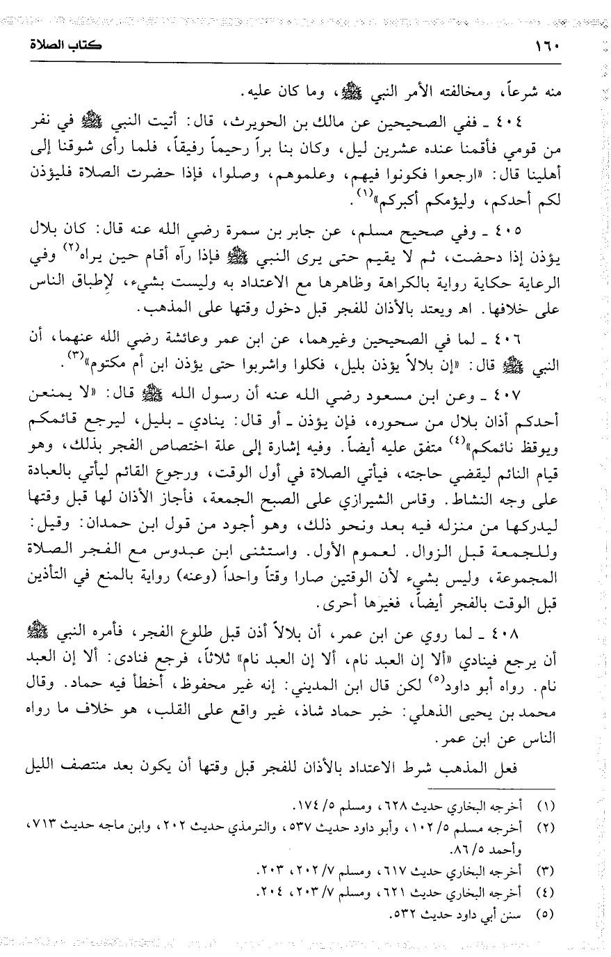 408 لما روى عن ابن عمر ، أن بلالًا أذن قبل طلوع الفجر ، فأمره النبي [ ] أن يرجع فينادي ( ألا إن العبد نام ، ألا إن العبد نام ) ثلاثاً ، فرجع فنادى : ألا إن العبد نام . رواه أبو داود لكن قال ابن المديني : إنه غير محفوظ ، أخطأ فيه حماد . وقال محمد بن يحيى الذهلي : خبر حماد شاذ ، غير واقع على القلب ، [ هو ] خلاف ما رواه الناس عن ابن عمر .