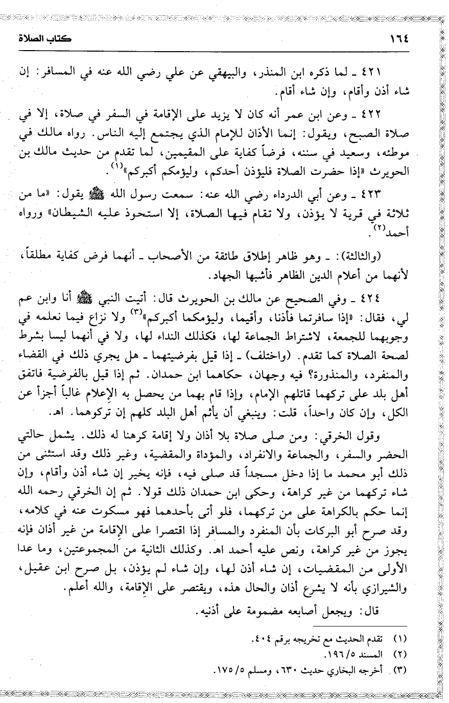 وقول الخرقي : ومن صلى صلاة بلا أذان ولا إقامة كرهنا له ذلك . يشمل حالتي الحضر والسفر ، والجماعة والأنفراد ، والمؤداة والمقضية ، وغير ذلك وقد استثنى من ذلك أبو محمد ما إذا دخل مسجداً قد صلى فيه ، فإنه يخير إن شاء أذن وأقام ، وإن شاء تركهما من غير كراهة ، وحكى ابن حمدان ذلك قولا . ثم إن الخرقي [ رحمه الله ] إنما حكم بالكراهة على من تركهما ، فلو أتى بأحدهما فهو مسكوت عنه في كلامه ، وقد صرح أبو البركات بأن المنفرد والمسافر إذا اقتصرا على الإِقامة من غير أذان فإنه يجوز من غير كراهة ، ونص عليه أحمد اه . ) 19 ( وكذلك الثانية من المجموعتين ، وما عدا الأولى من المقضيات ، إن شاء أذن لها ، وإن شاء لم يؤذن ، بل صرح ابن عقيل ، والشيرازي بأنه لا يشرع أذان والحال هذه ، ويقتصر على الإِقامة ، والله أعلم .