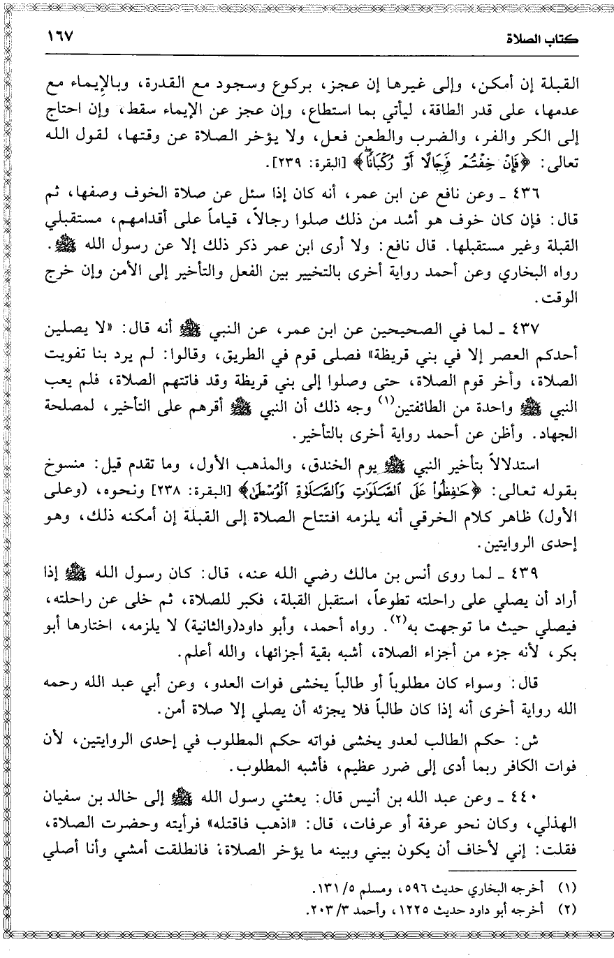436 وعن نافع ابن عمر ، أنه كان إذا سئل عن صلاة الخوف وصفها ، ثم قال : فإن كان خوف [ هو ] أشد من ذلك صلوا رجالًا ، قياماً على أقدامهم ، مستقبلي القبلة وغير مستقبلها . قال نافع : ولا أرى ابن عمر ذكر ذلك إلا عن رسول الله . رواه البخاري وعن أحمد رواية أخرى بالتخيير بين الفعل والتأخير إلى الأمن وإن خرج الوقت .
