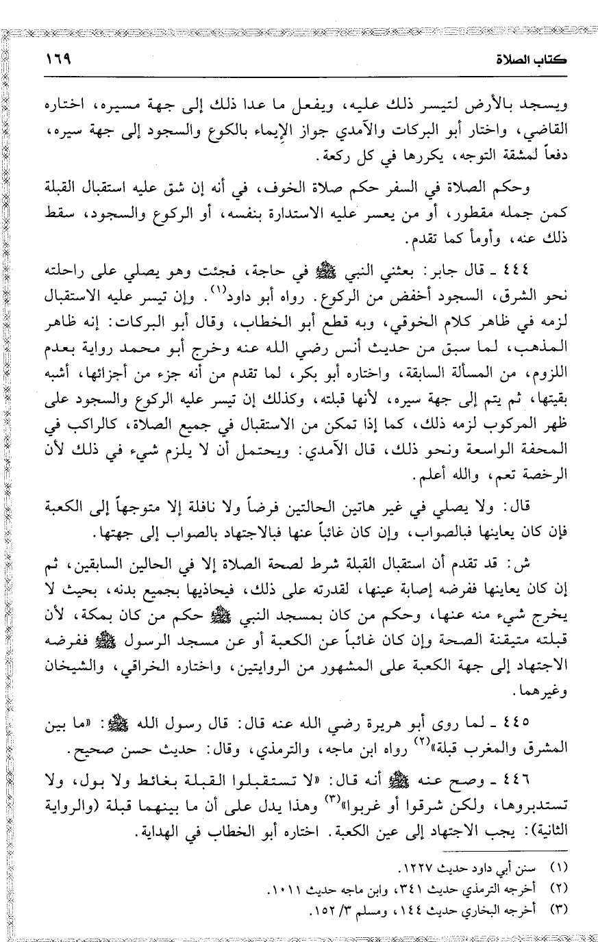 444 قال جابر : بعثني النبي [ ] في حاجة ، فجئت وهو يصلي على راحلته ونحو الشرق ، السجود أخفض من الركوع . رواه أبو داود . وإن تيسر عليه الإِستقبال لزمه في ظار كلام الخوقي ، وبه قطع أبو الخطاب ، وقال أبو البركات : إنه ظاهر المذهب ، لما سبق من حديث أنس [ رضي الله عنه ] وخرج أبو محمد رواية بعد اللزوم ، من المسألة السابقة ، واختاره أبو بكر ، لما تقدم من أنه جزء من أجزائها ، أشبه بقيتها ، ثم يتم إلى جهة سيره ، لأنها قبلته ، وكذلك إن تيسر عليه الركوع والسجود على ظهر المركوب لزمه ذلك ، كما إذا تمكن من الاستقبال في جميع الصلاة ، كالراكب في المحفة الواسعة ونحو ذلك ، قال الآمدي : ويحتمل أن لا يلزم شيء في ذلك [ لأن ] الرخصة تعم ، والله أعلم .