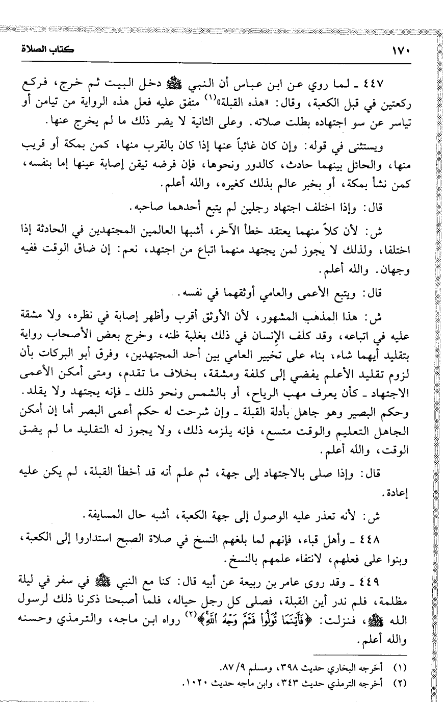 447 لما روي عن ابن عباس أن النبي [ ] دخل البيت ثم خرج ، فركع ركعتين في قبل الكعبة ، وقال : ( هذه القبلة ) متفق [ عليه ] فعل هذه الرواية من تيامن أو تياسر عن سو اجتهاده بطلت صلاته . وعلى الثانية لا يضر ذلك ما لم يخرج عنها .