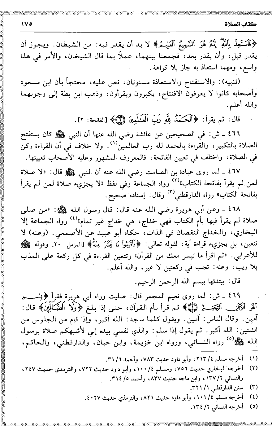 467 لما روى عبادة بن الصامت [ رضي الله عنه ] أن النبي قال : ( لا صلاة لمن لم يقرأ بفاتحة الكتاب ) رواه الجماعة وفي لفظ ( لا يجزيء صلاة لمن لم يقرأ بفاتحة الكتاب ) رواه الدارقطني وقال : إسناده صحيح .