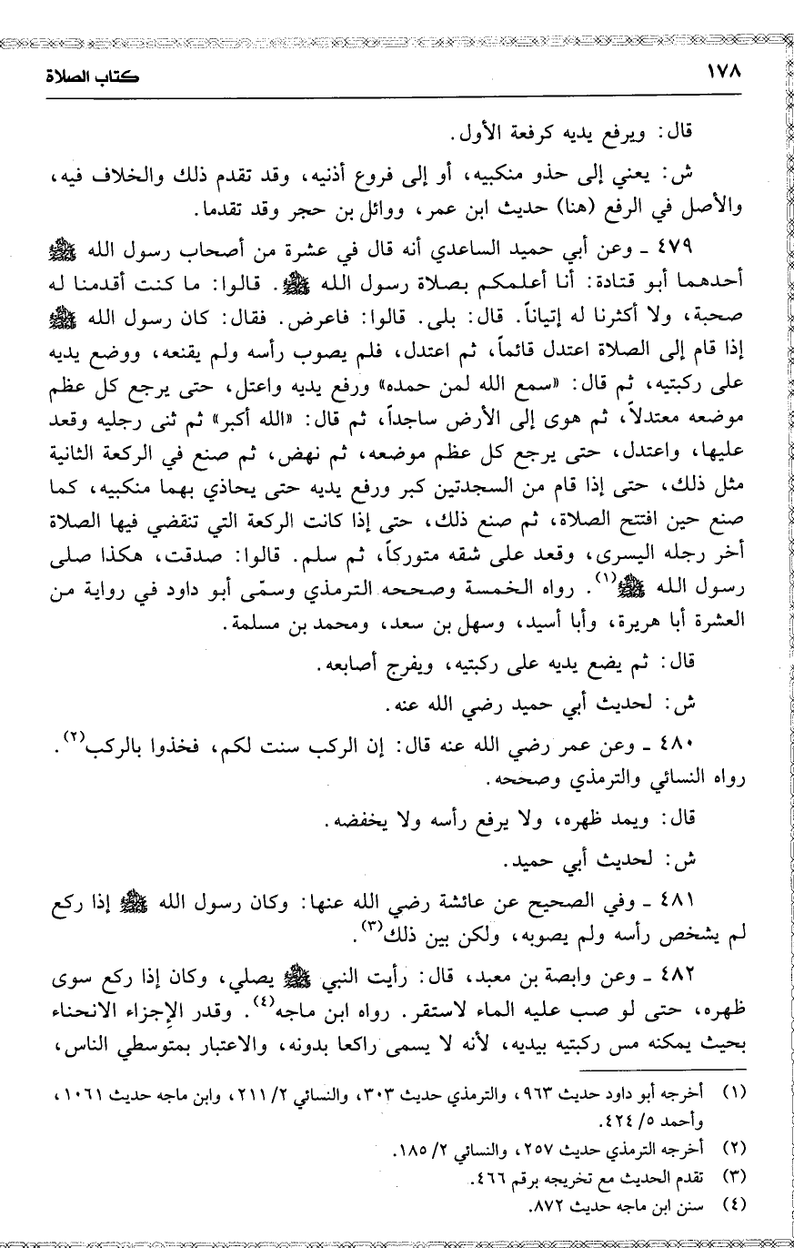 وعن أبي حميد الساعدي أنه قال في عشرة من أصحاب رسول الله [ ] أحدهما أبو قتادة : أنا أعلمكم بصلاة رسول الله . قالوا : ما كنت أقدمنا له صحبة ، ولا أكثرنا له إتياناً . قال : بلى . قالوا : فاعرض . فقال : كان رسول الله إذا قام إلى الصلاة اعتدل قائماً ، ثم اعتدل ، فلم يصوب رأسه ولم يقنعه ، ووضع يديه على ركبتيه ، ثم قال : ( سمع الله لمن حمده ) ورفع يديه واعتل ، حتى يرحع كل عظم موضعه معتدلًا ، ثم هوى إلى الأرض ساجداً ، ثم قال : ( الله أكبر ) ثم ثنى رجليه وقعد عليها ، واعتدل ، حتى يرجع كل عظم موضعه ، ثم نهض ، ثم صنع في الركعة الثانية مثل ذلك ، حتى إذا قام من السجدتين كبر ورفع يديه حتى يحاذي بهما منكبيه ، كما صنع حين افتتح الصلاة ، ثم صنع ذلك ، حتى إذا كانت الركعة التي تنقضي فيها الصلاة أخر رجله اليسرى ، وقعد على شقه متوركاً ، ثم سلم . قالوا : صدقت ، هكذا صلى رسول الله . رواه الخمسة وصححه الترمذي وسمّى أبو داود في رواية من العشرة أبا هريرة ، وأبا أسيد ، وسهل بن سعد ، ومحمد بن مسلمة .