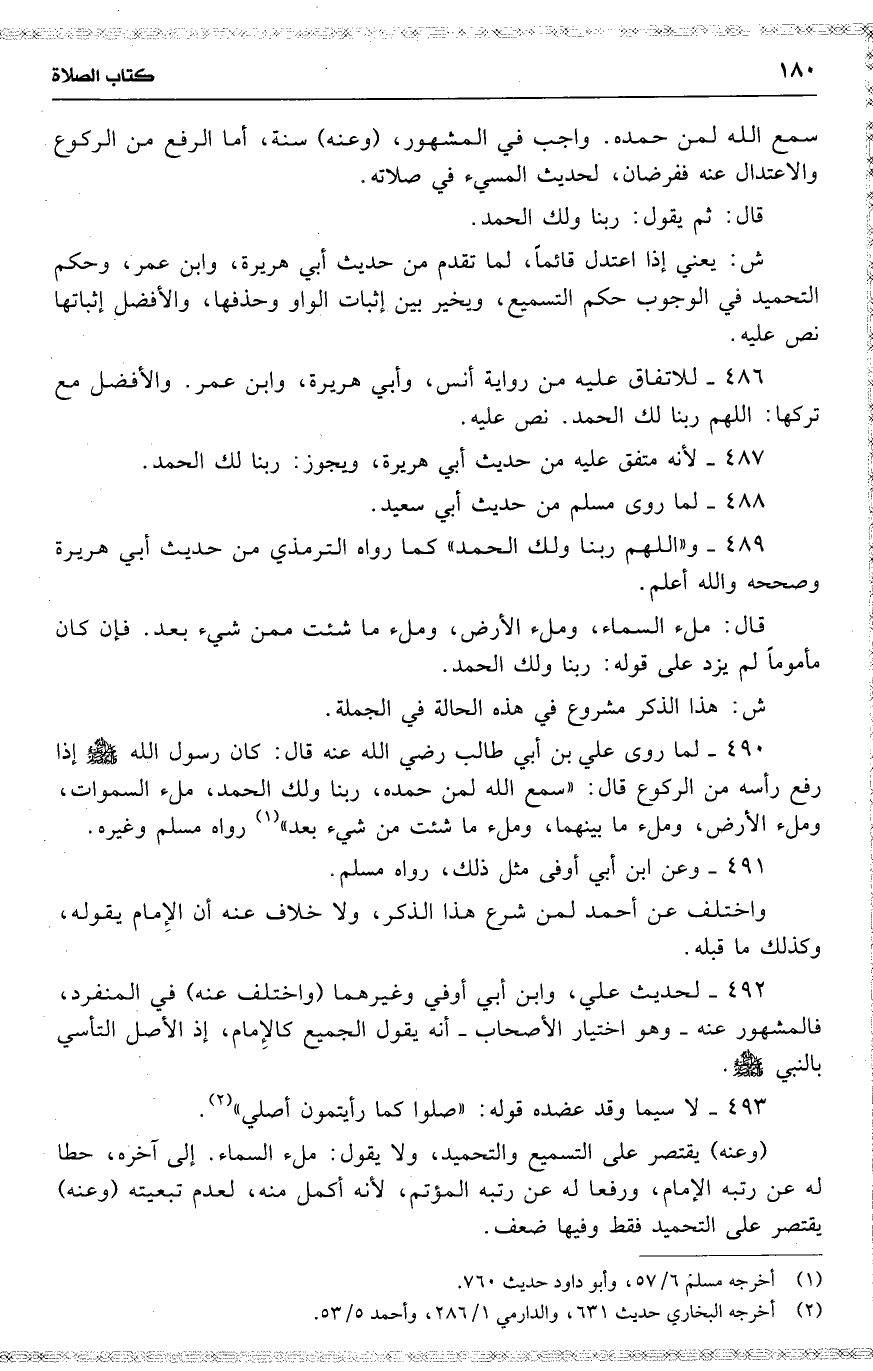 490 لما روى علي بن أبي طالب [ رضي الله عنه ] قال : كان رسول الله إذا رفع رأسه من الركوع قال : ( سمع الله لمن حمده ، ربنا ولك الحمد ، ملء السموات ، وملء الأورض ، وملء ما بينهما ، وملء ما شئت من شيء بعد ) رسواه مسلم وغيره .