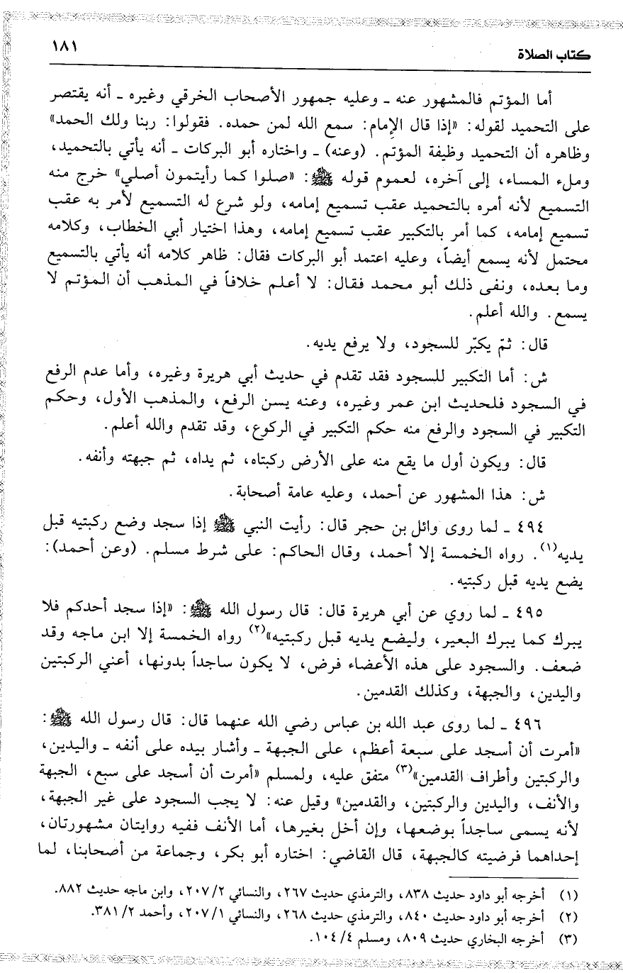 495 لما روي عن أبي هريرة قال : قال رسول الله : ( إذا سجد أحدكم فلا يبرك كما يبرك البعير ، وليضع يديه قبل ركبتيه ) رواه الخمسة إلا ابن ماجه وقد ضعف . والسجود على هذه الأعضاء فرض ، لا يكون ساجداً بدونها ، أعني الركبتين وليدين ، والجبهة ، وكذلك القدمين .